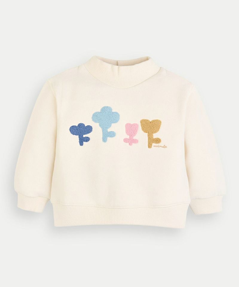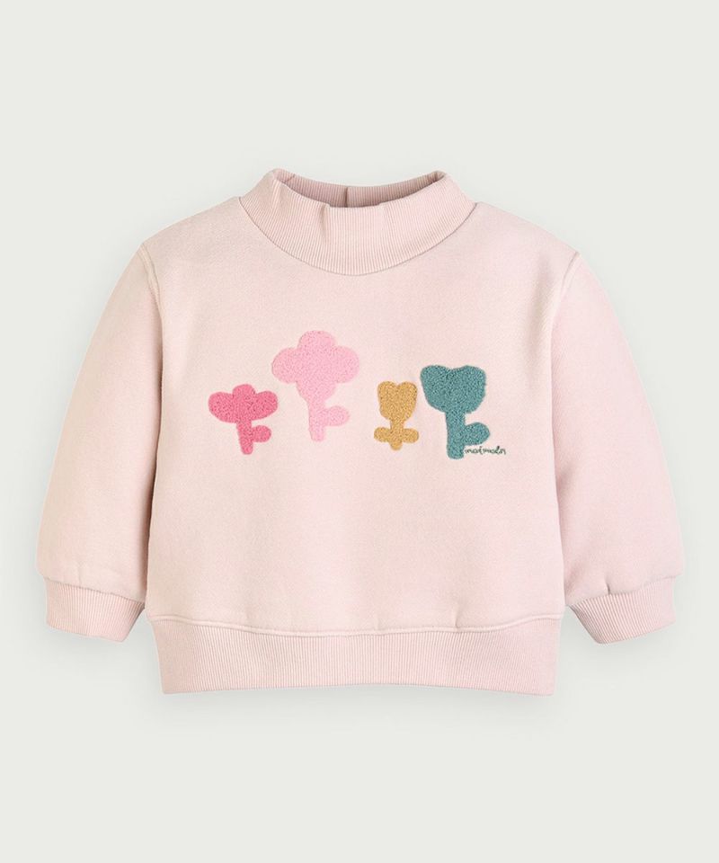 暖かくてさらっとしたウールの起毛生地のモックネック長袖Tシャツ。フロントのフラワーモチーフのブクル刺繍がポイントで、シンプルなのに可愛いムードのアイテムです。