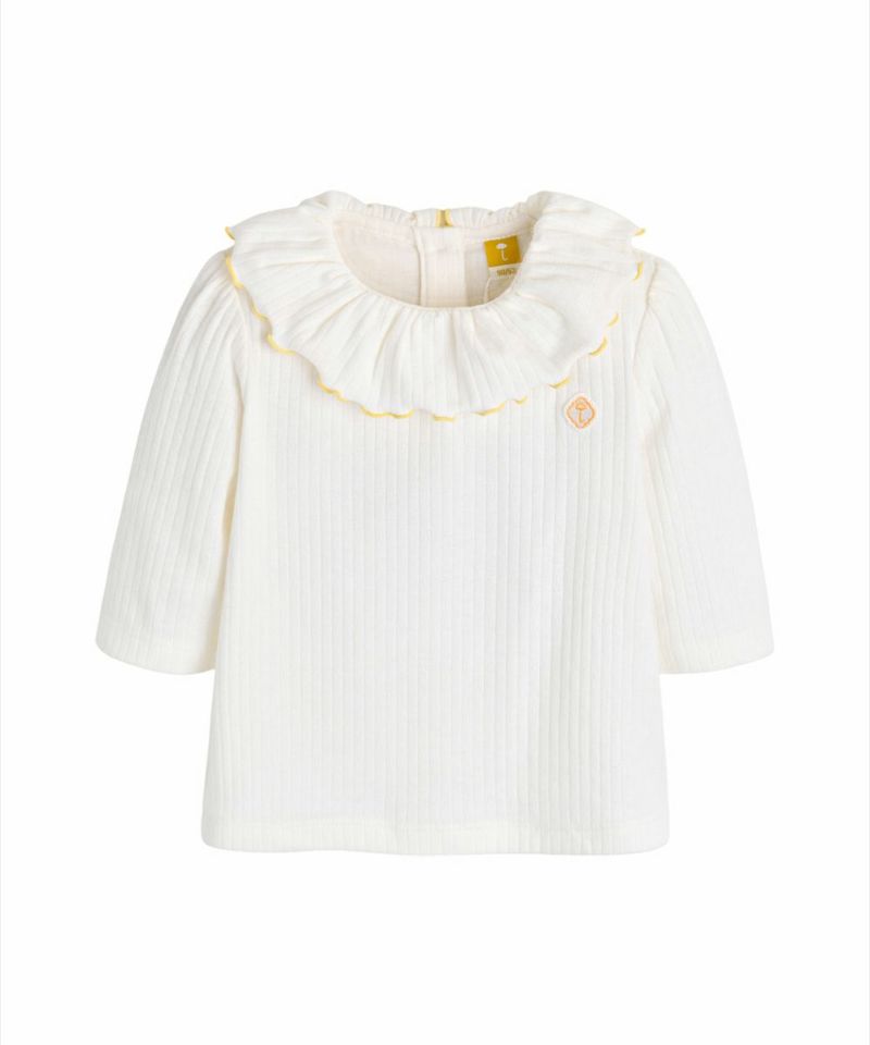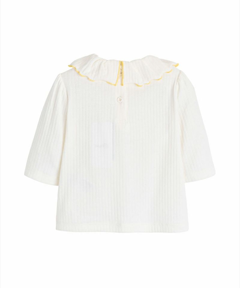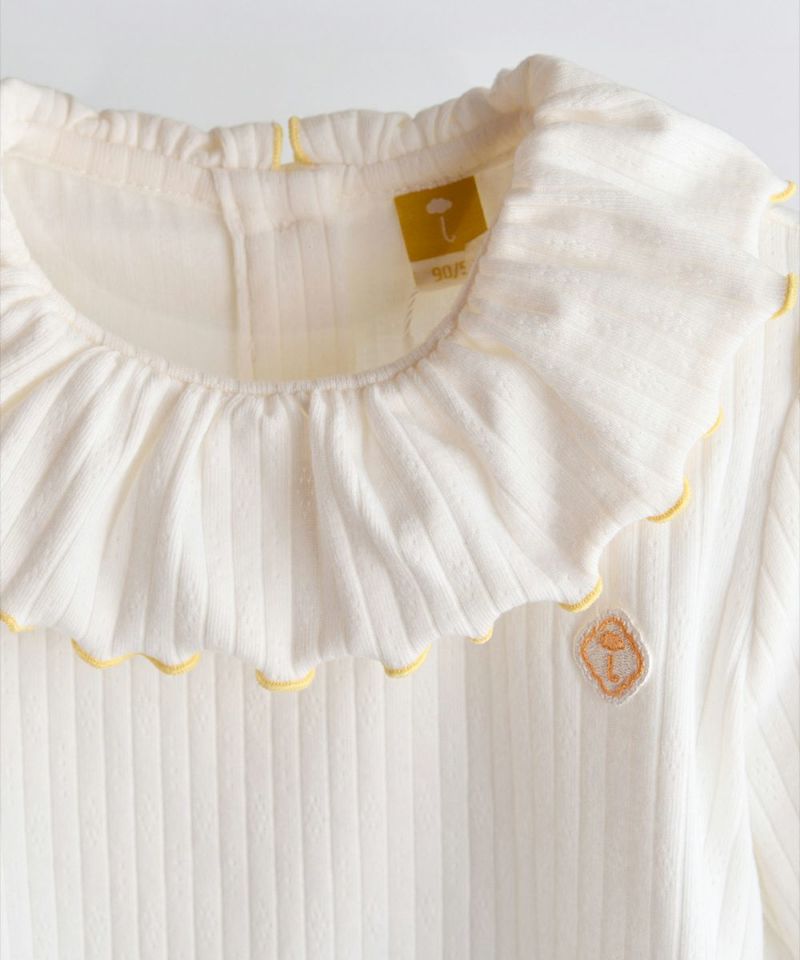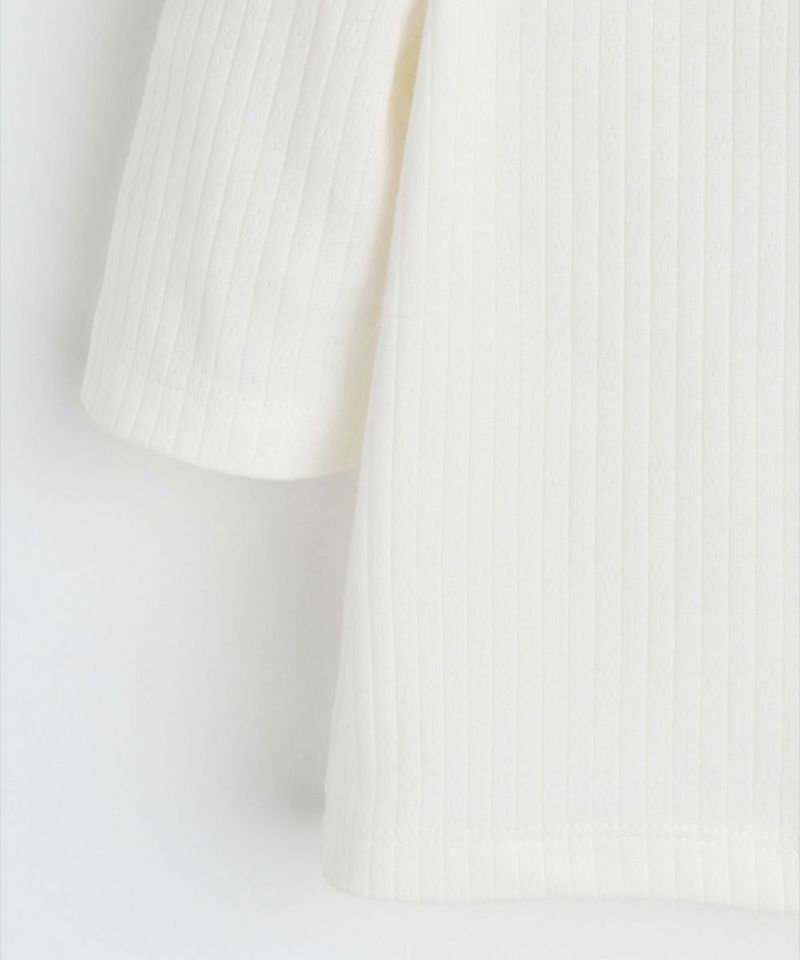 襟先のくねくねとしたディテールがラブリーさをプラスする7分袖Tシャツ。伸縮性に優れており、同じ素材のレギンス(M252KPF10P)とコーディネートすると快適なデイリールックを楽しめるアイテムです。