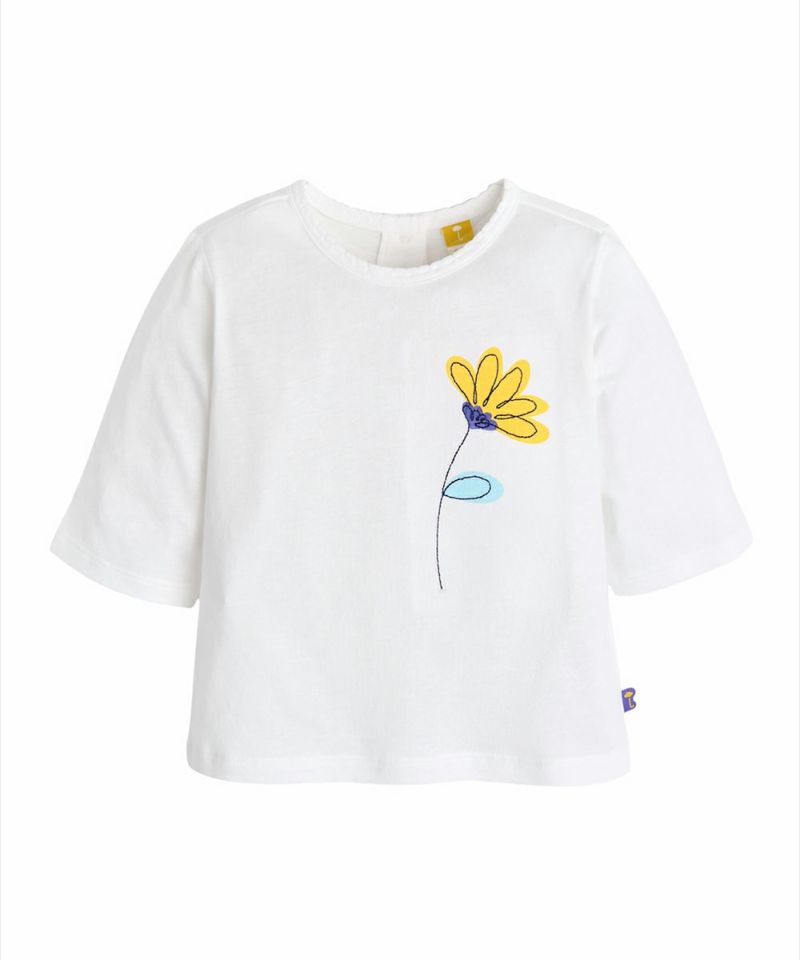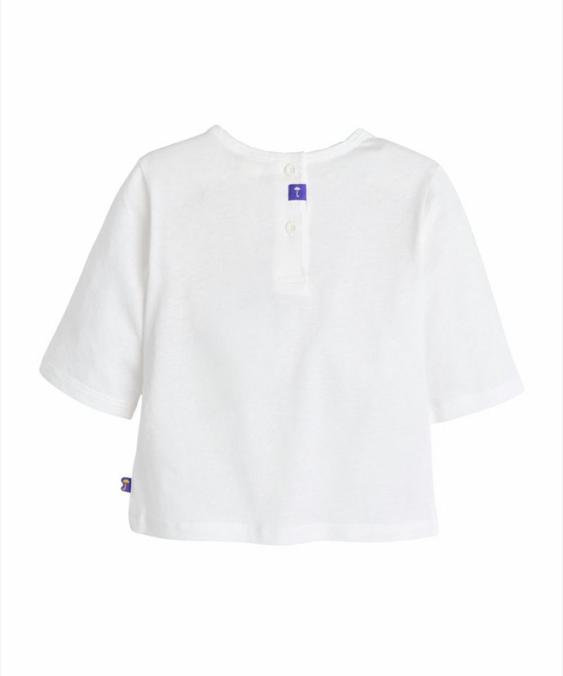 なめらかなタッチ感と優れた吸湿性を持つモーダル素材を使った七分袖のTシャツ。ネック部分に可愛らしいスクープポイントと胸の方にビッグフラワーアートワークで1つだけ着てもコーデのポイントになるデイリーアイテム。生地のタッチ感に敏感な子供たちにおすすめのアイテムです。