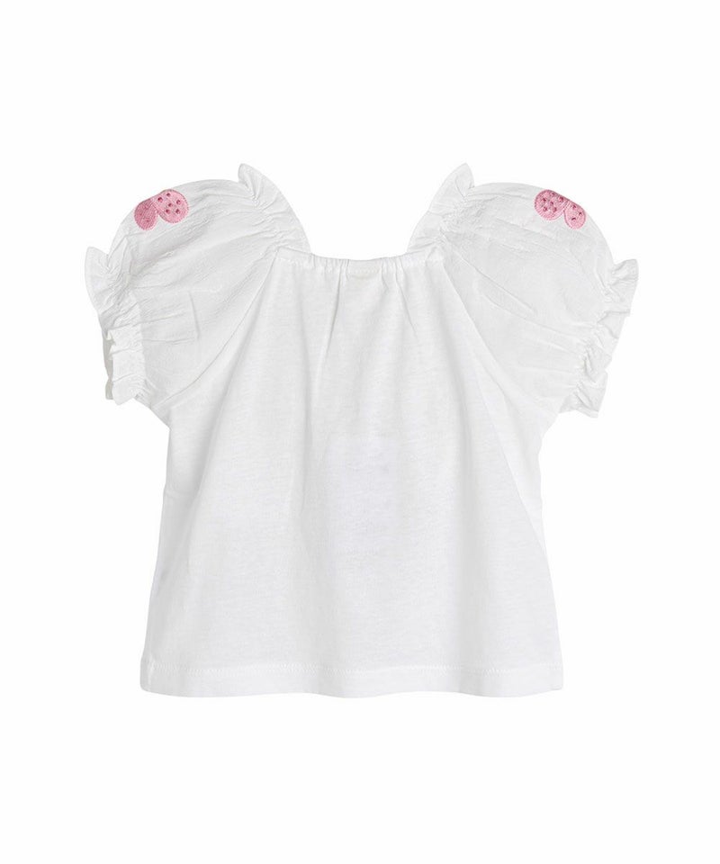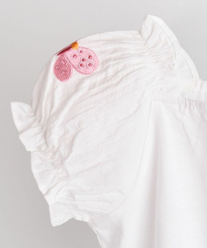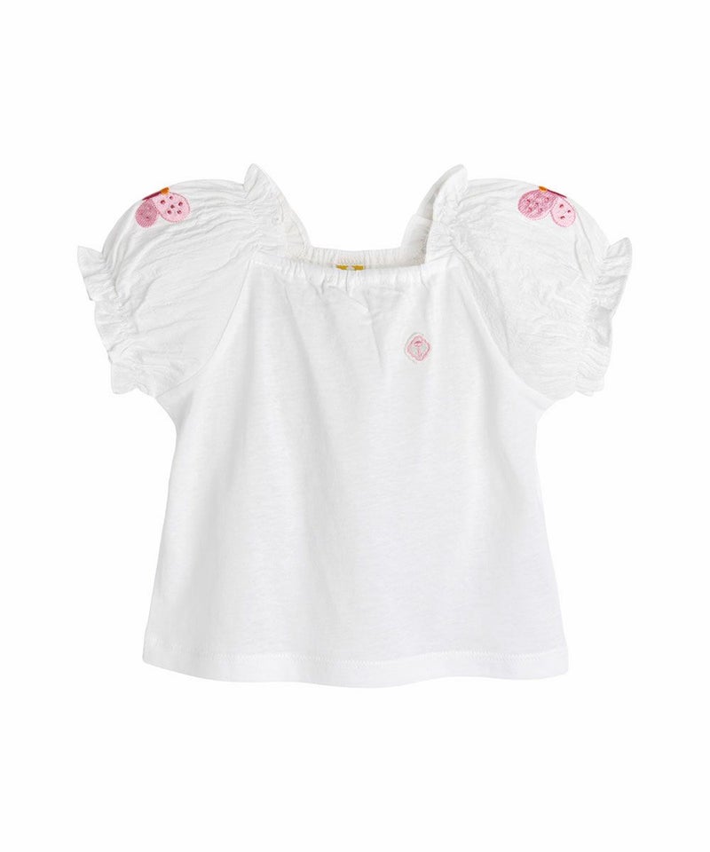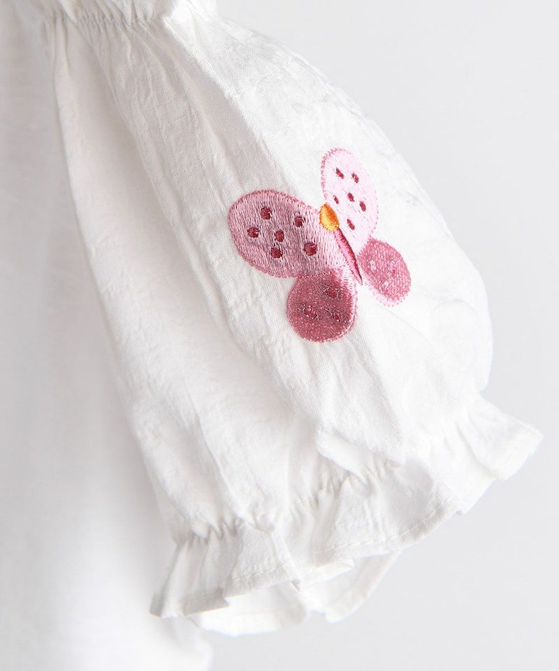 薄くて柔らかい 素材とパフ袖がマッチしたラブリーなフィットの半袖Tシャツ。スクエアネックにはゴムバンドが入っているため、ボタン留めがなく簡単に着脱でき、袖には涼しげなウーブンヨル素材を使用し、ボリューム感をアップさせ蝶々モチーフの刺繍を加えラブリーさをプラスした洗濯後も変形が少ないアイテムです。