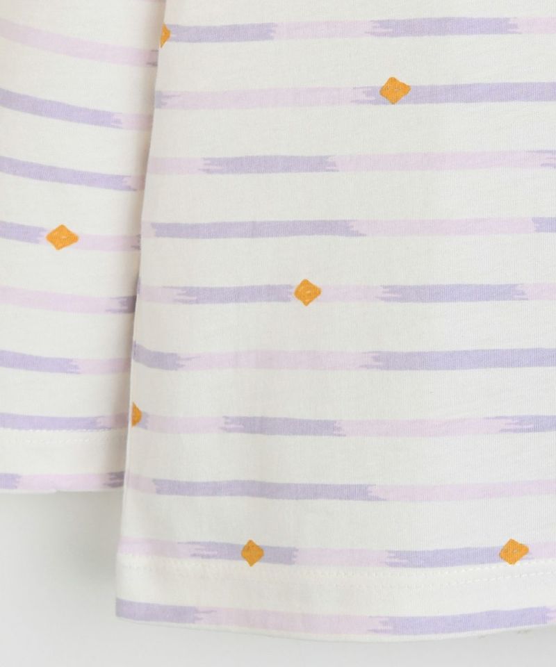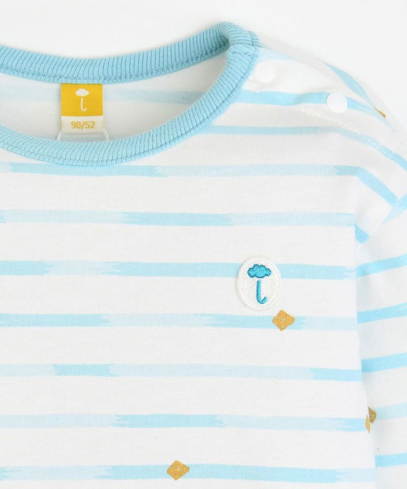 筆タッチのようなカラーボーダーの長袖Tシャツ。胸元のmoimolnマークの刺繍ワッペンや肘裏の配色パッチでポイントを与え、軽くソフトなタッチ感の素材で製作しているため、肩のスナップボタンで脱着も簡単。デイリールックとして重宝するアイテムです。