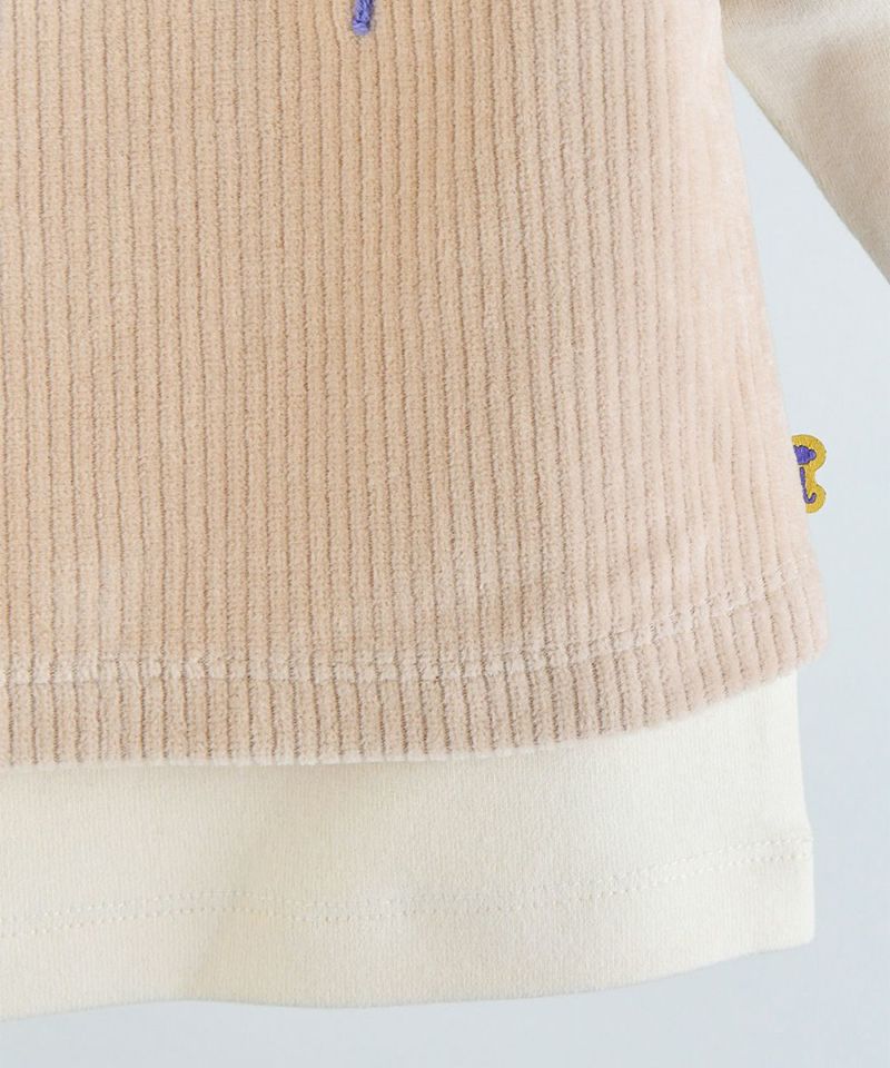コットンに伸縮性のある素材をプラスし気心地の良さをプラスした長袖トップス。パフスリープの袖とキャミソールをレイヤーしたようなデザインは女の子らしさを更にアップさせてくれます。フロントのブルー調のステッチ刺繍がアクセントに。