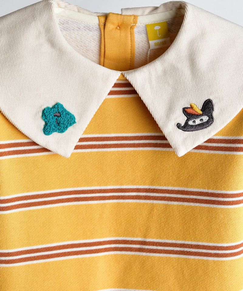 明るいカラー配色の生地を使用したトップスに、襟の可愛らしい刺繍がポイントの見た目も暖かいセットアップです。