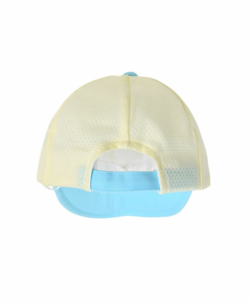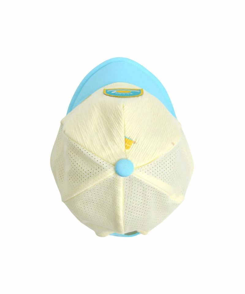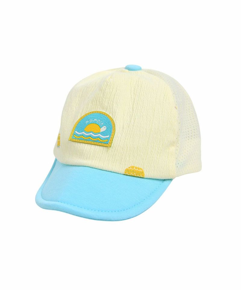 アクアブルーとイエローカラーのコントラストがポイントのキャップ。前にはかわいいカメさんたち、後はメッシュ混の生地で通気性がよく暑い季節にも適した帽子です。