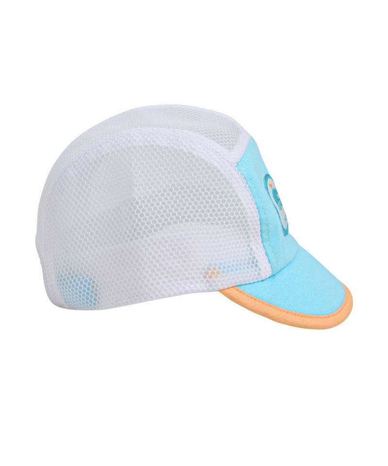 アクアブルーとオレンジカラーのバランスがおしゃれなキャップ。前はクジラワッペンがアクセントに、後はメッシュ混の生地で通気性がよく暑い季節にも適した帽子です。