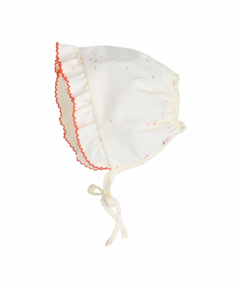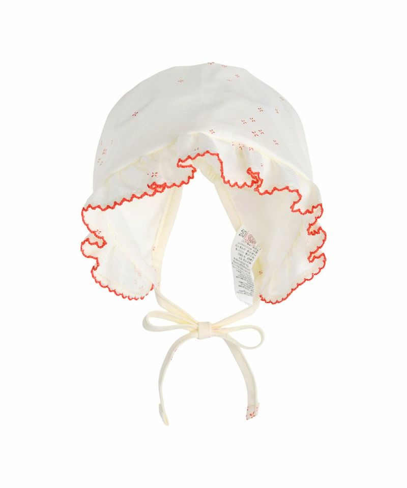 クリーム系の優しいカラーに刺繍パイピングがアクセントになったボンネット帽子。おしゃれアイテムとしてコーデにプラスしたり日よけとしてもおすすめです。コットン100%となっています。