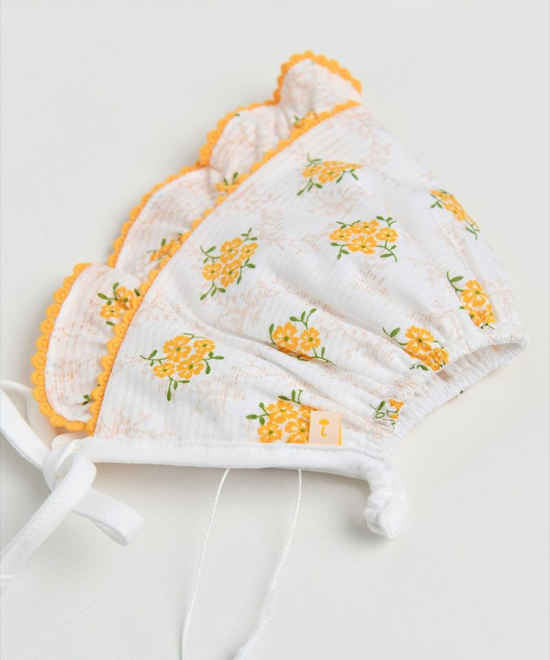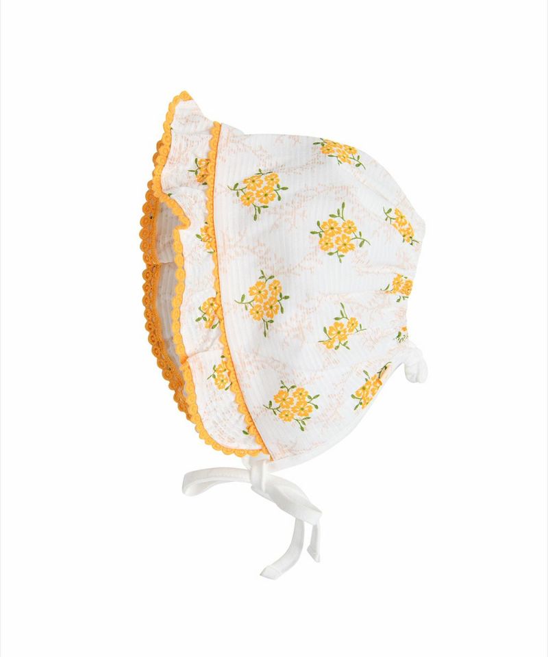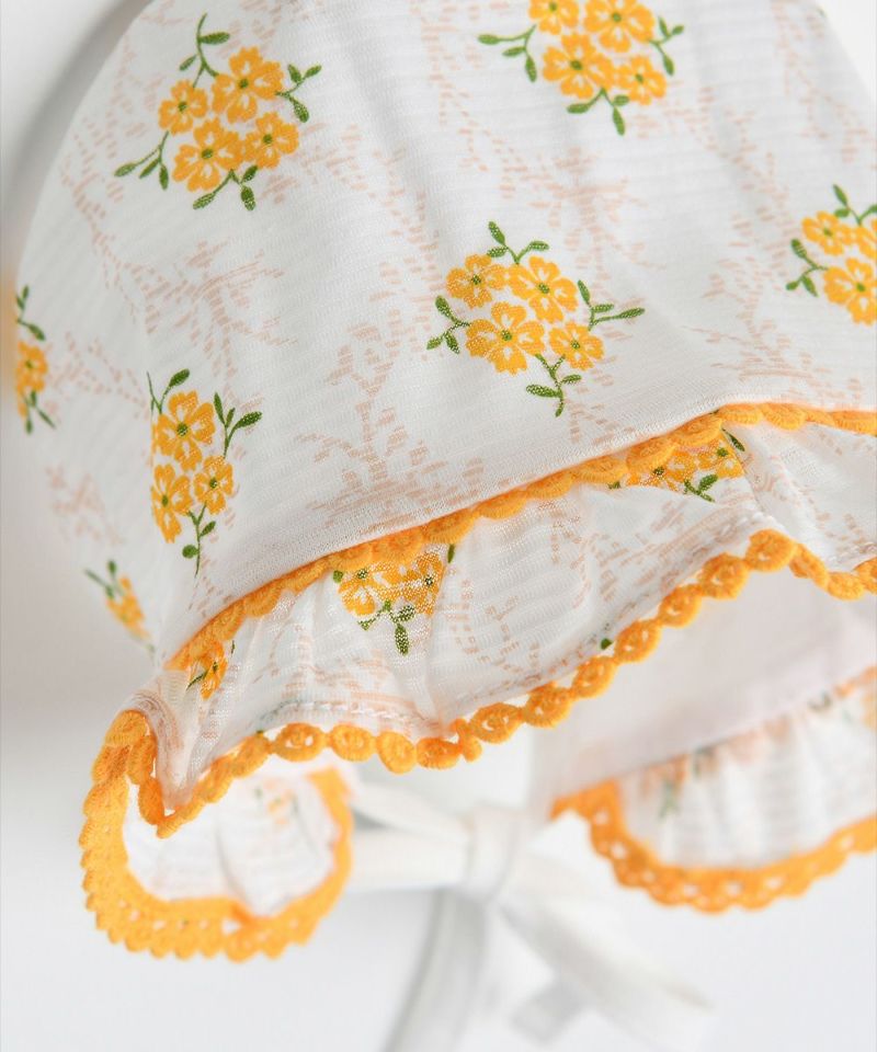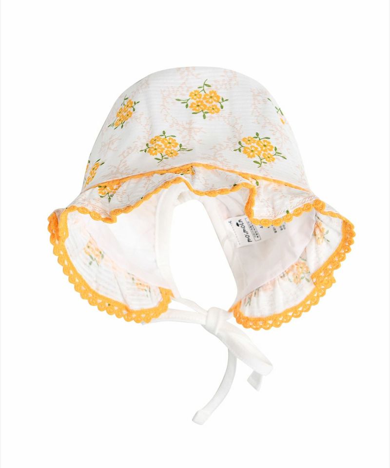 速いスピードで汗を吸収・乾燥させ、涼しさを維持してくれる素材で、フラワー柄とイエローレースがポイントのボンネット。【ReReクール】ダリアカバーオール(W242UUN30P)とのコーディネートがおすすめです。