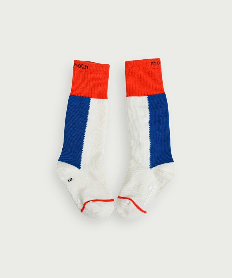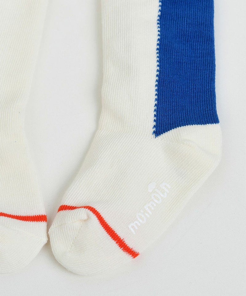 レッド×ブルーのカラーブロックデザインの膝下丈の靴下。