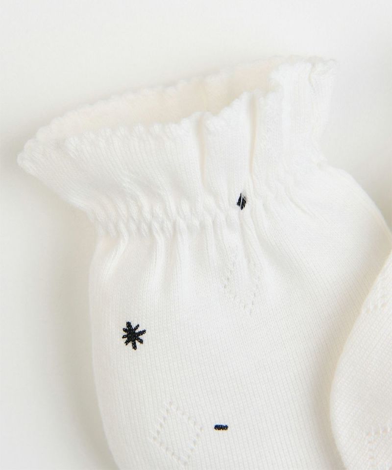 ふわふわしたジャガード生地の上に小さな星をちりばめたような柄のミトン。爪で弱い肌を傷つけるのを防ぎ、手を温かく保温してくれるミトンは新生児の寝具用、出産準備用、幅広い用途でお使いいただけます。出産祝いのギフトとしても大変喜ばれる商品です。秋のシーズンアンダー、minimoiリンクルアイレットシリーズ(おくるみ M2551JW01P)のセット使いもおすすめです。minimoiとは・・・新生児のための新しいmoimolnのオリジナルシリーズ。