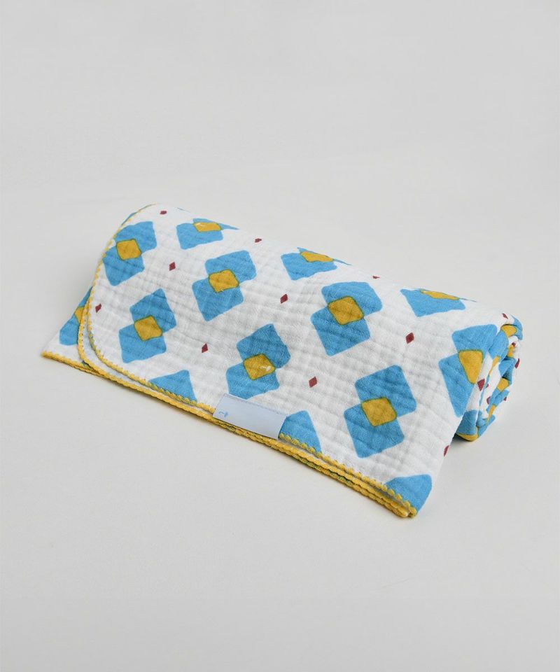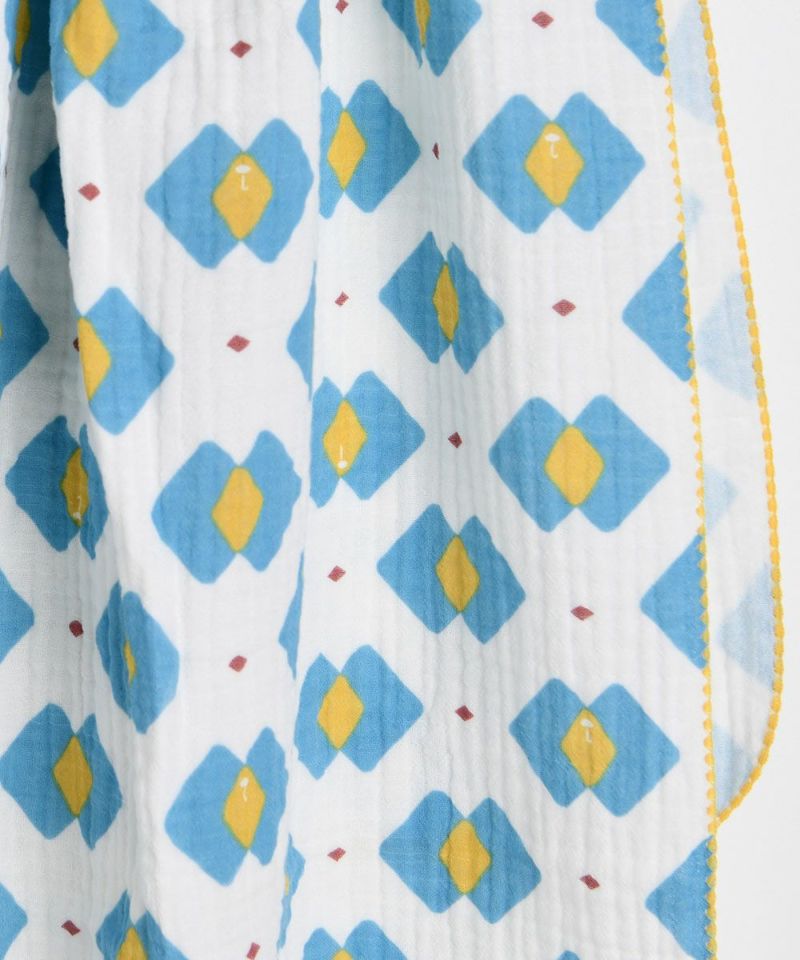 シーズンアンダーにも使われた幾何学モチーフ柄に、縁にカラーポイントを与えたブランケット。ヨールガーゼ素材を使用している為、通気性に優れ、汗のかきやすい赤ちゃんの布団代わりにも使えるヨル加工仕様。春から夏まで外出時にも手軽に使いやすい多用途アイテムです。