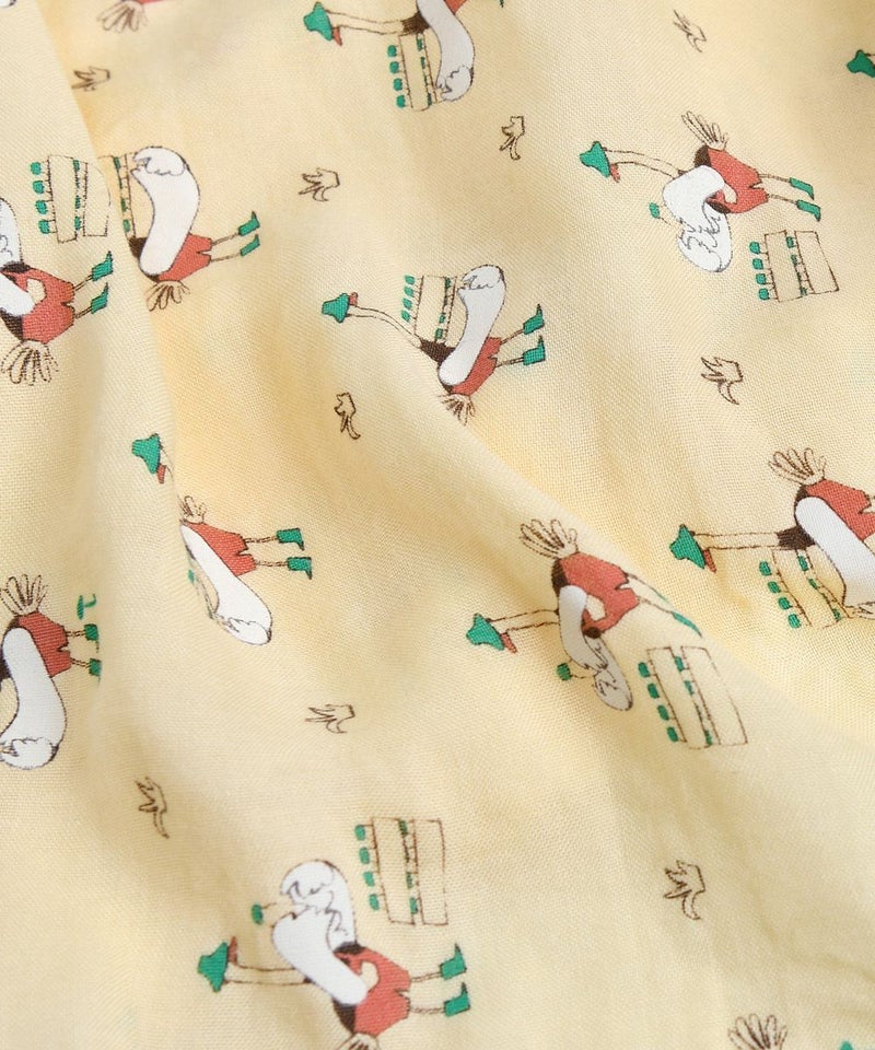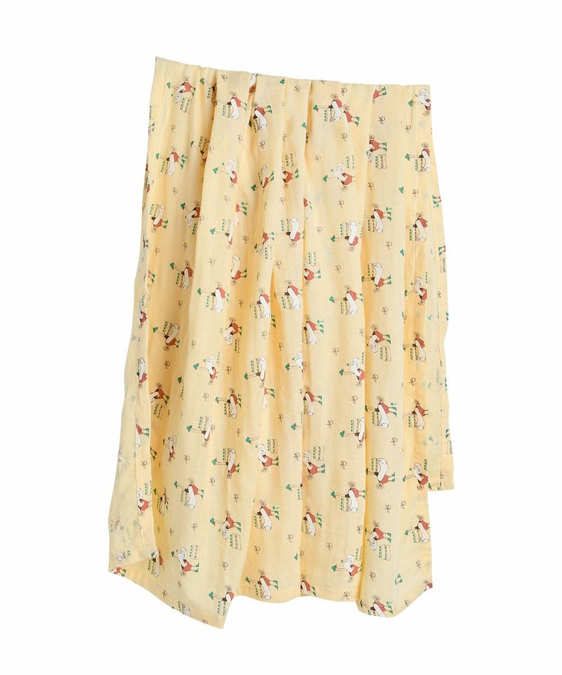 牛乳を持っているガチョウ柄のガーゼケットで、春から夏まで外出時に手軽に使いやすいアイテム。バンブーガーゼを使用している為、柔らかく通気性に優れており汗をかきやすい子にぴったりな多用途ガーゼケットです。
