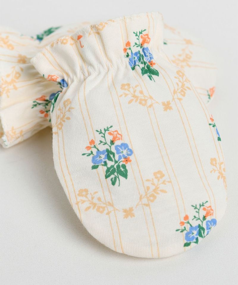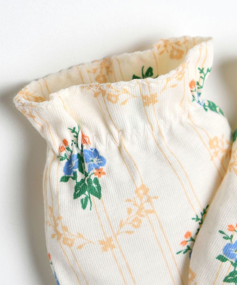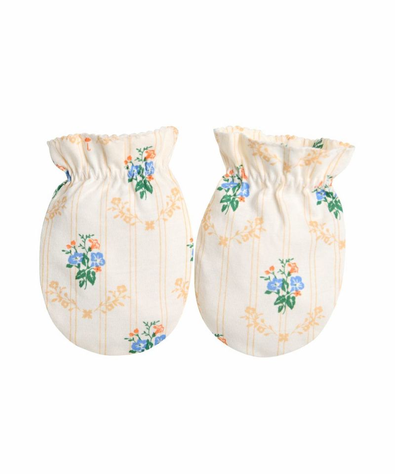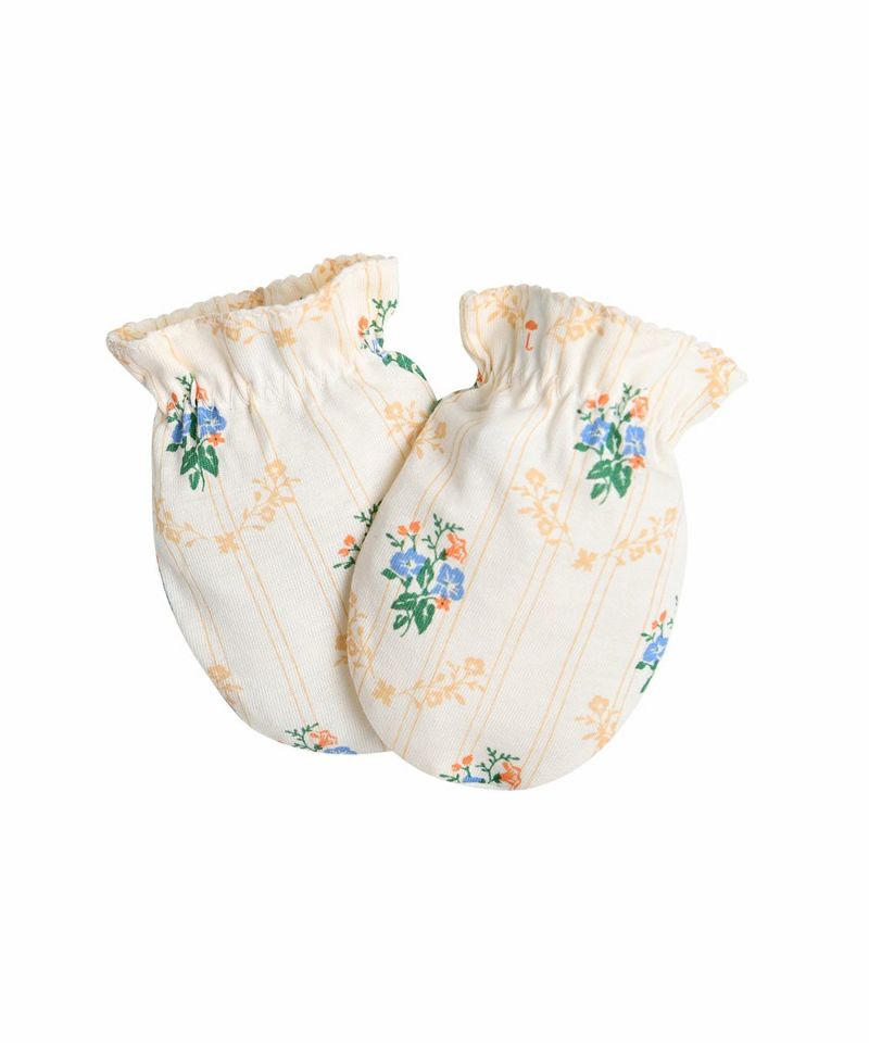 雰囲気のある花柄のバンブーシングルミトン。おくるみとシリーズで構成されており、爪で肌を傷つけるのを防ぎ、手を温めてくれるアイテム。チェルシーズシリーズの【バンブーコットン】チェルシーおくるみ(W2451JW63P)とセット使いがおすすめです。