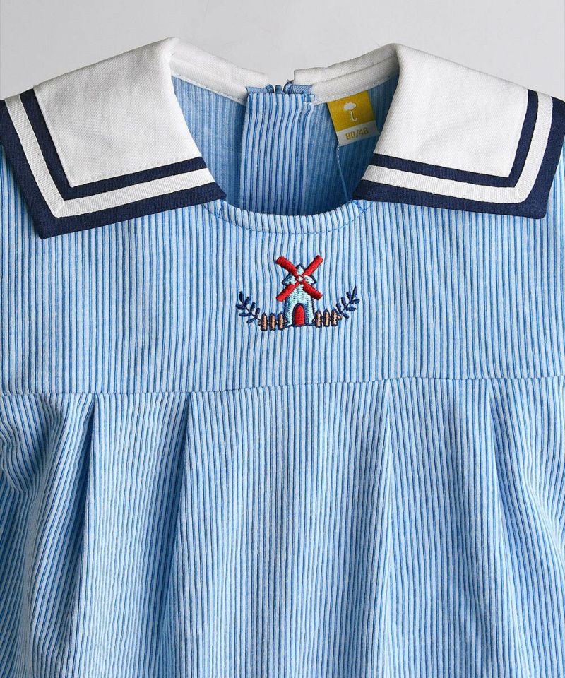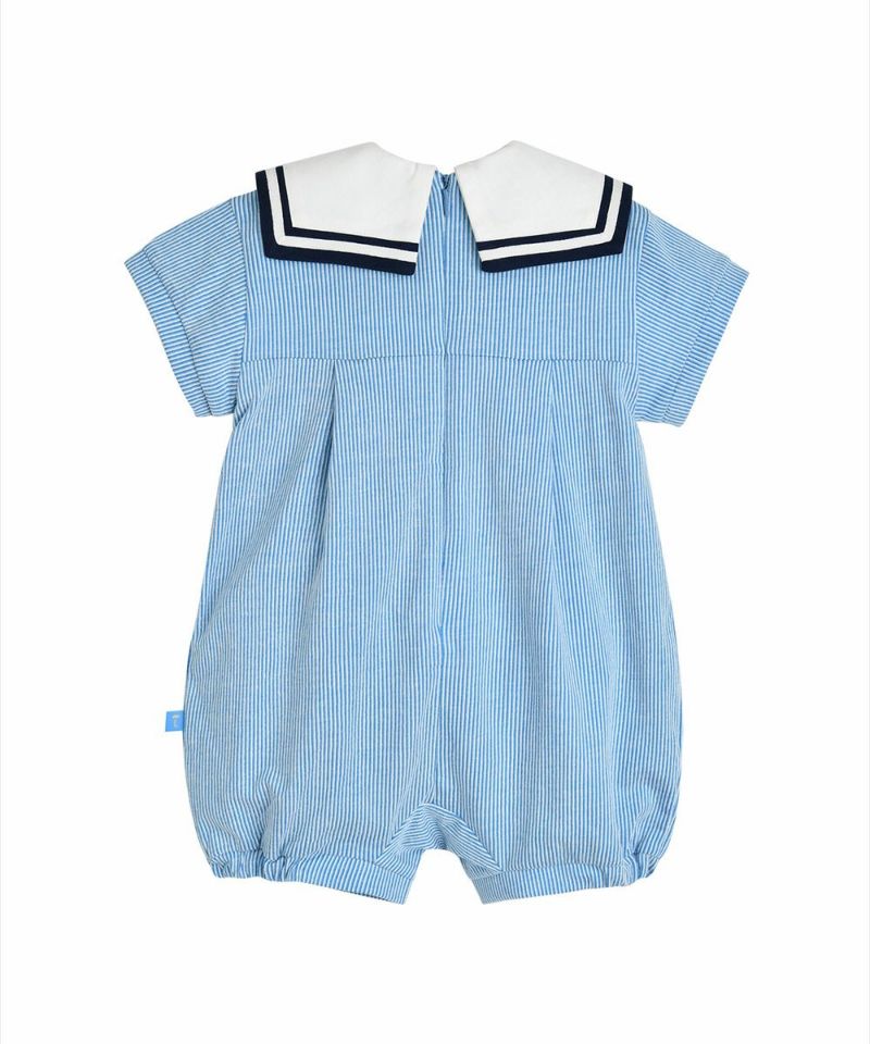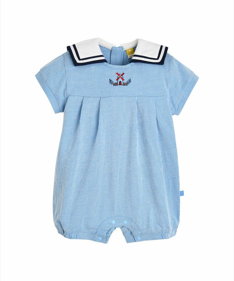 マリンルックのようなデザインの半袖カバーオールセット。ボリュームのあるシルエットがポイントで、(M242STB28P)と兄弟ルックがおすすめです。