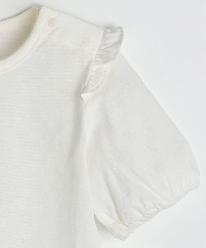 ユニークなフラワー柄と胸元の白いレースがポイントの7分丈カバーオール。肩フリルがおしゃれな7分丈トップスとセットになっており、プレゼント用にもぴったりなアイテム。アンティークフラワー半袖ロンパース(M242BUN23P)と兄妹ルックがおすすめです。