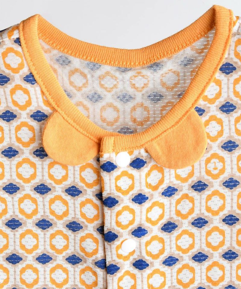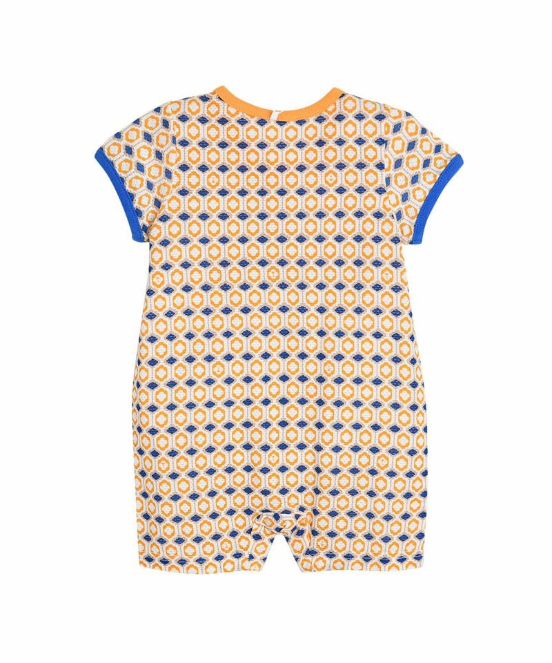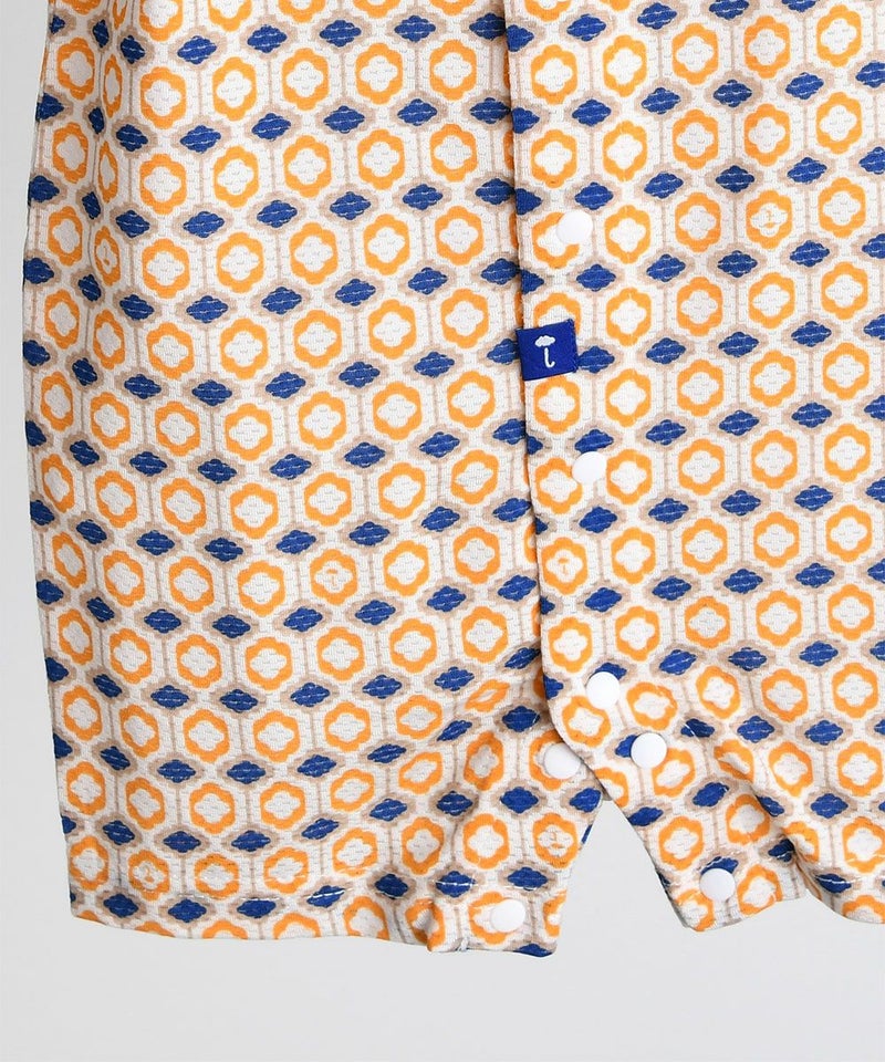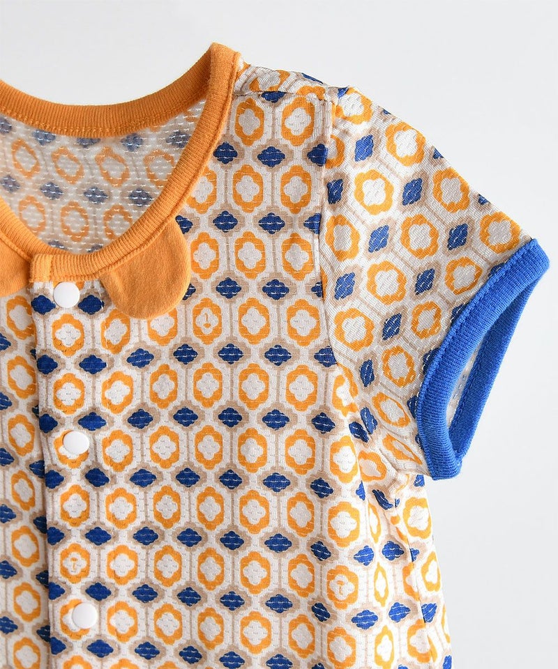 通気性に優れ、涼しく、体に貼りつきにくいレーヨンメッシュ素材で幾何学柄とネック部分の立体モチーフがポイントの半袖カバーオール。モダンレトロ半袖トップス&パンツ(W242NNN51P)と兄妹ルックがおすすめです。