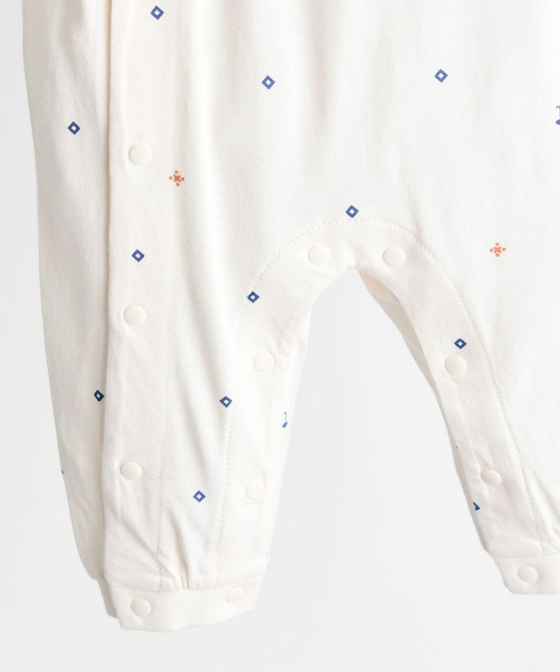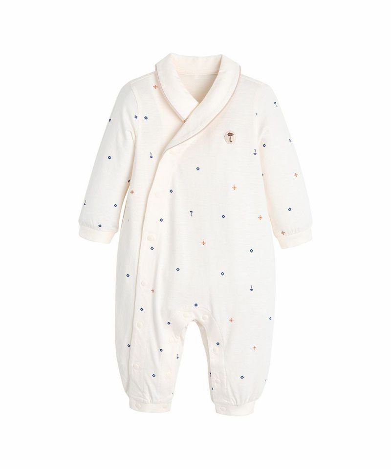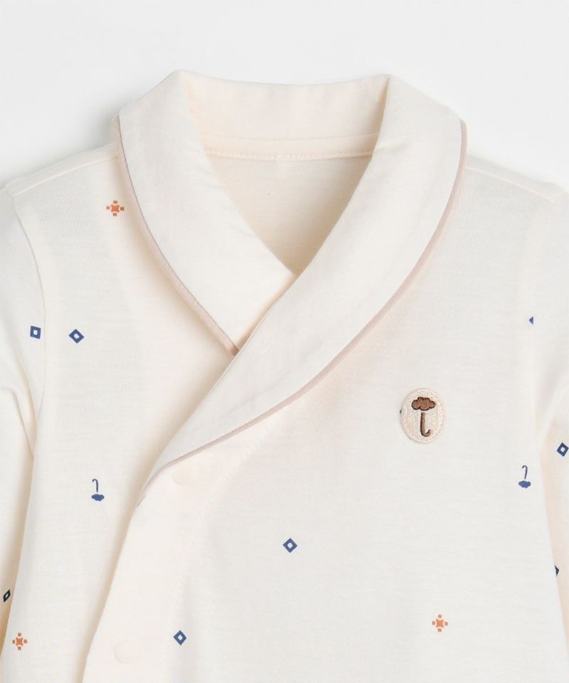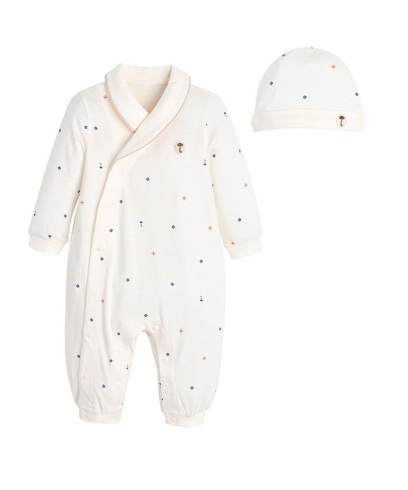 抗菌_消臭効果に優れた柔らか素材のバンブーカバーオール。図形柄にのベージュ配色とワッペンがポイントのアイテム。ワッペンのついた帽子がセットのカバーオールセットです。