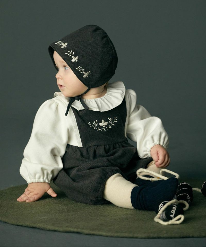 トーンダウンカラーの帽子がセットで構成されたカバーオールセット。レイヤード風のデザインと刺繍のポイントが高級感溢れ、プレゼント用にもおすすめなアイテムです。