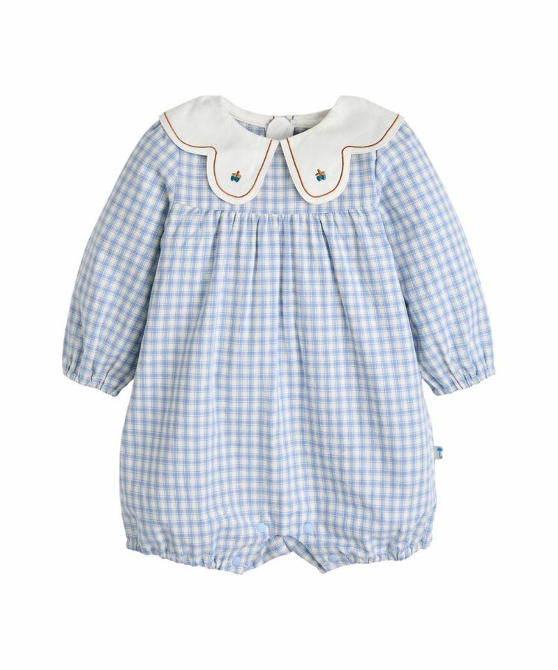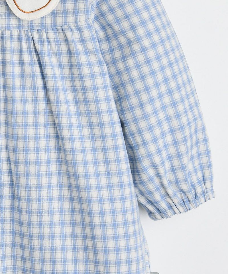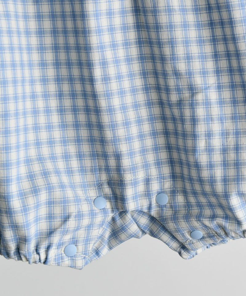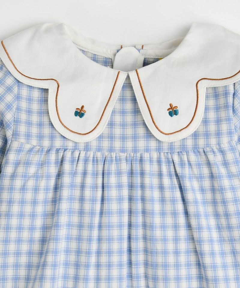 高級感のあるチェックウーブンにラブリーな蝶々の形をした襟とフラワー刺繍がユニークなカバーオール。かぼちゃパンツの様なシルエットが可愛いアイテム。リアムロングソックス(M251TII07P)とコーディネートがおすすめで、ブルーチェックワンピース(M251OPB08P)とは姉妹ルックとして楽しめます。
