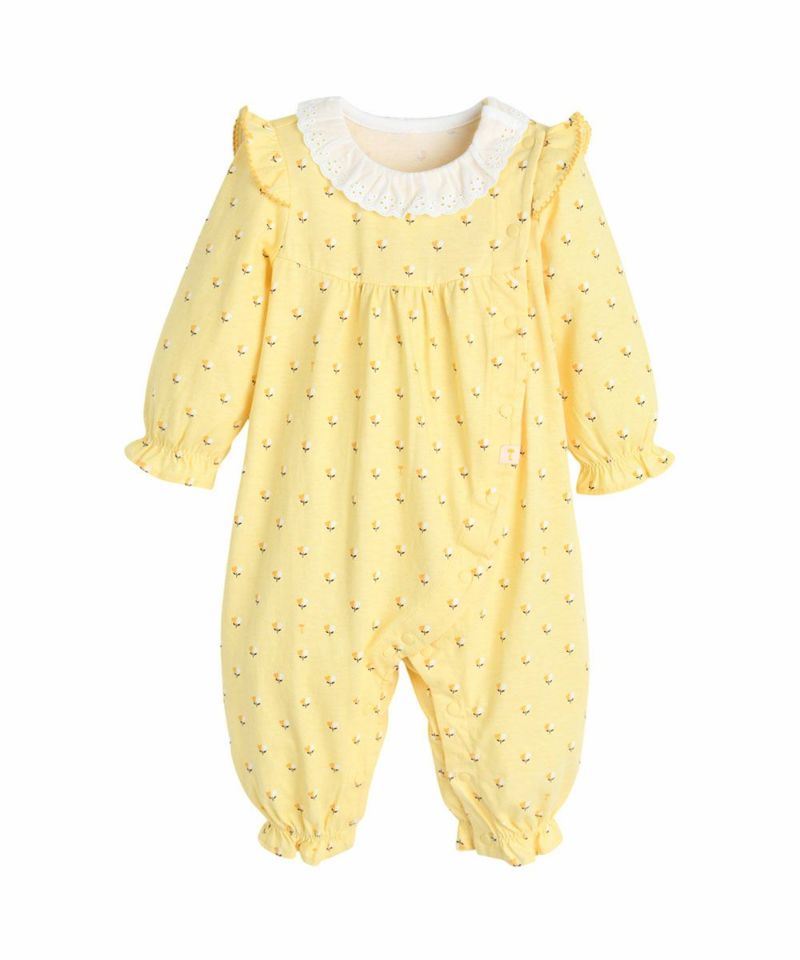 人気の小花柄カバーオール。肩やフロントのフリルなど細かな所にもこだわったデザインがポイントです。
