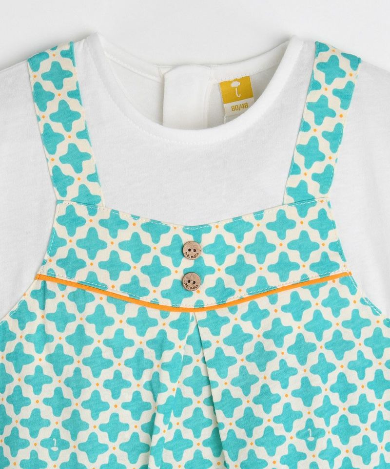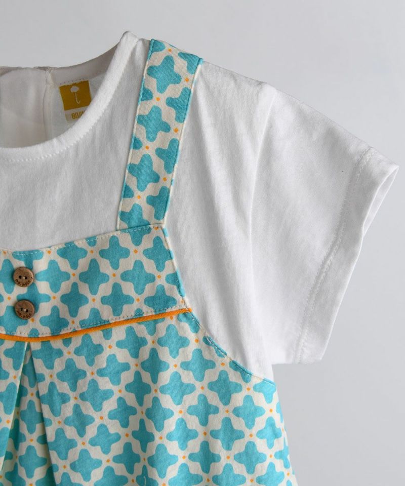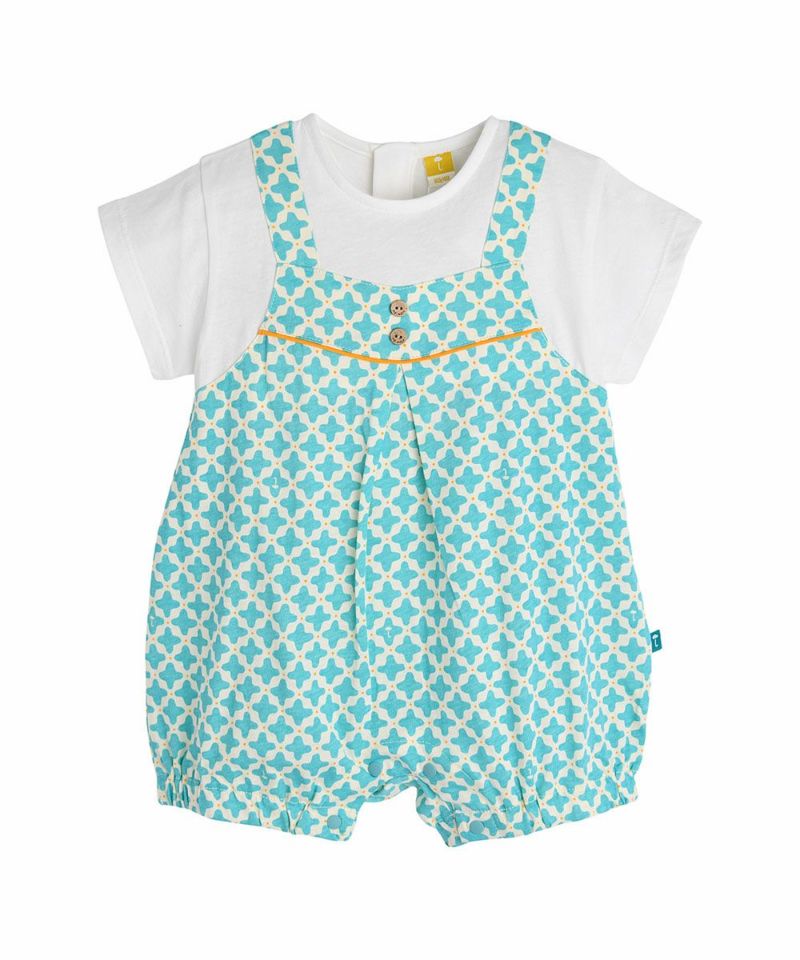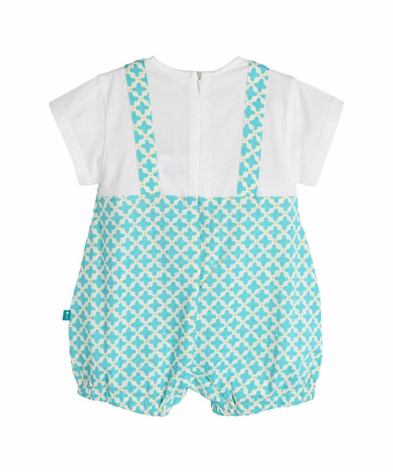 Tシャツを重ね着したようなレイヤード風カバーオール。幾何学模様がポイント♪ヤシボタンで夏らしさも演出します。