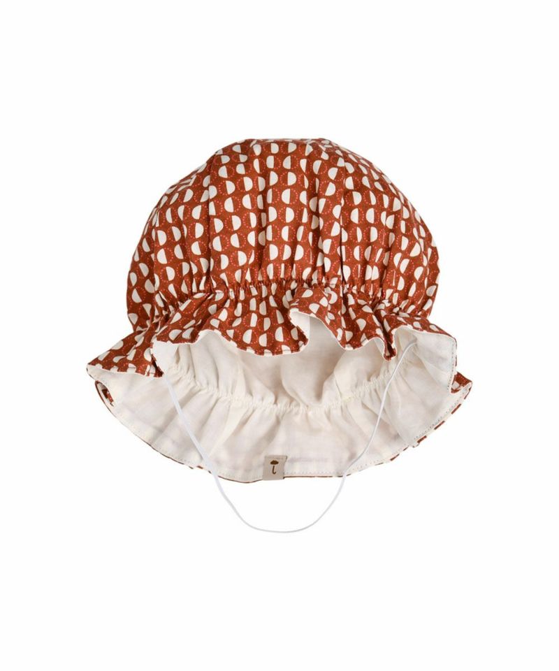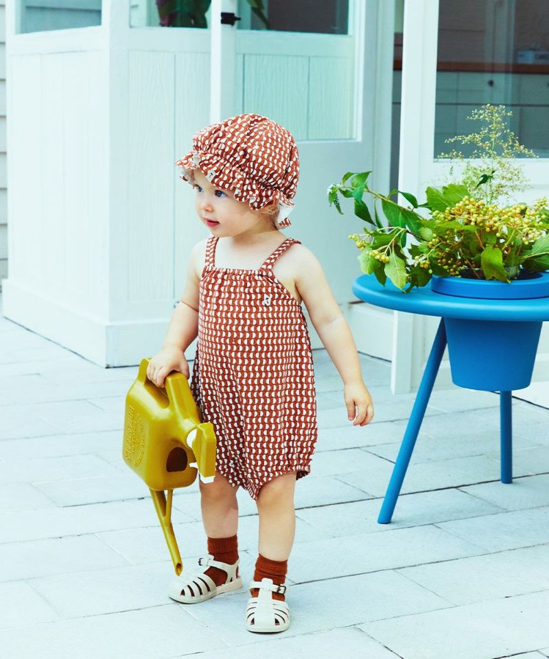 レトロ感のある幾何学柄カバーオールと帽子のセットアイテム。ふわりとした帽子が可愛いらしい印象に♪ベビーギフトとしても喜ばれるアイテムです。