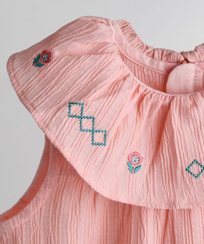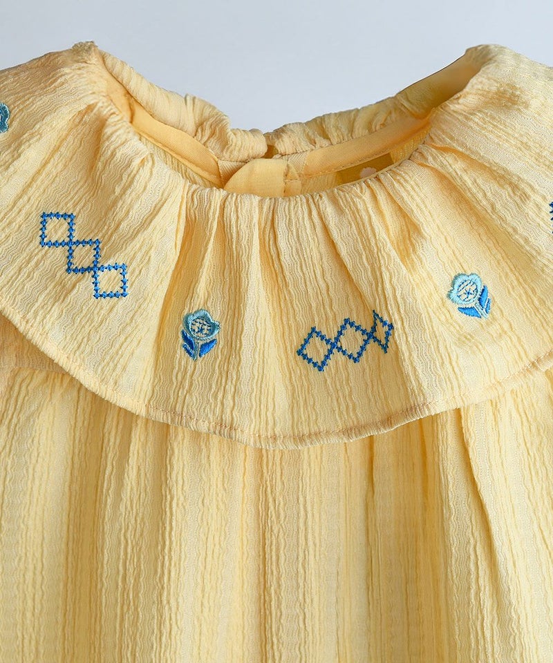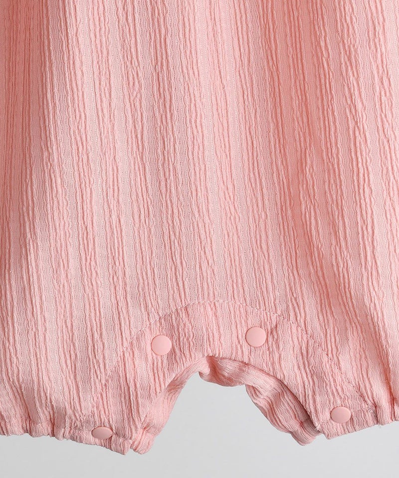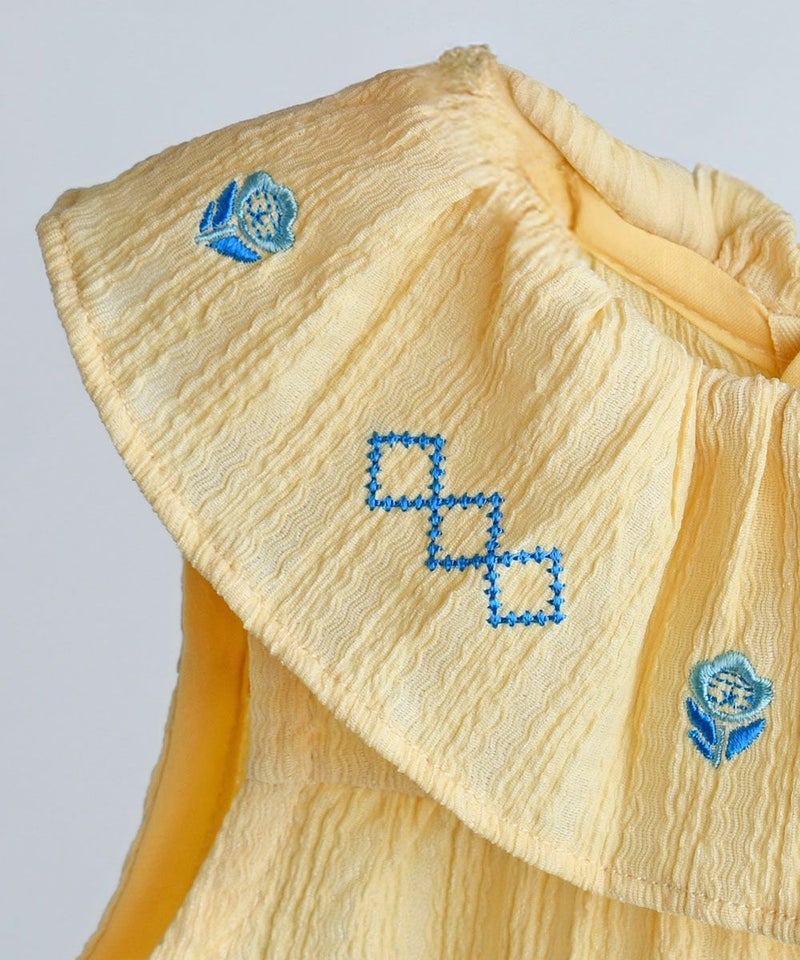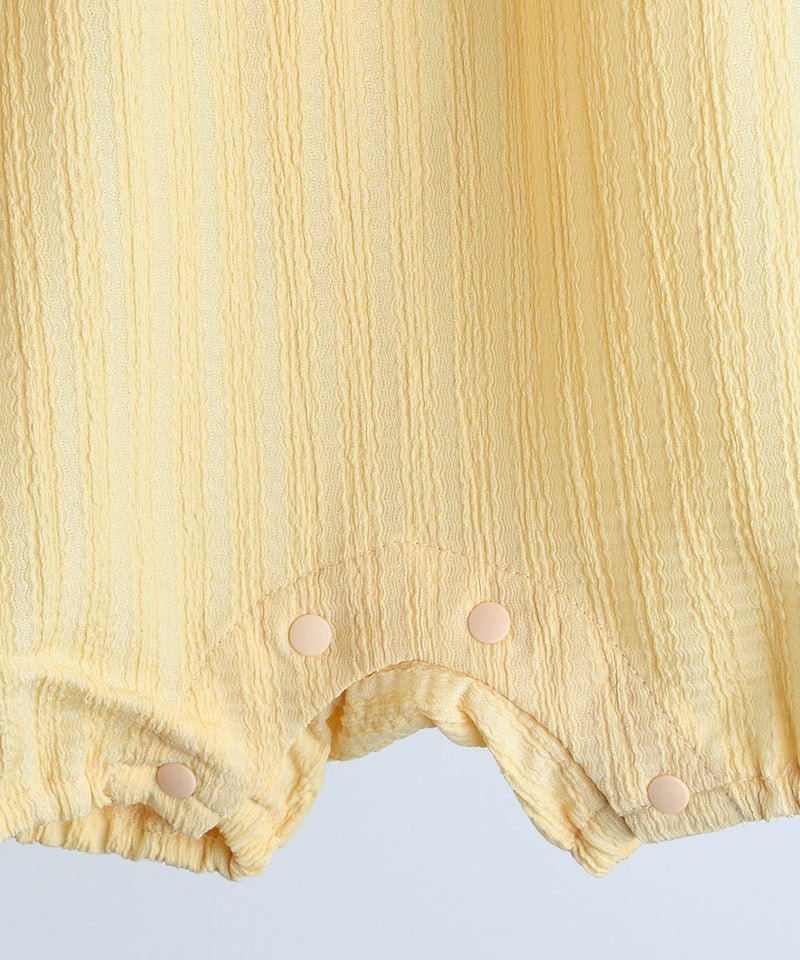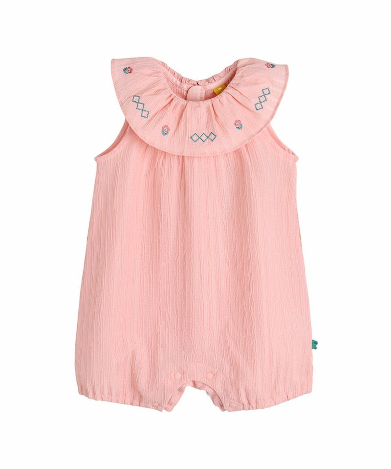 フリル襟に可愛い刺繍が施されたカバーオール。体に引っ付きにくい素材を使用しており、濡れても早く乾くため、暑い夏に活用度が良いアイテムです。