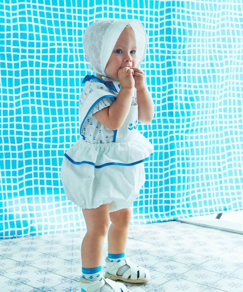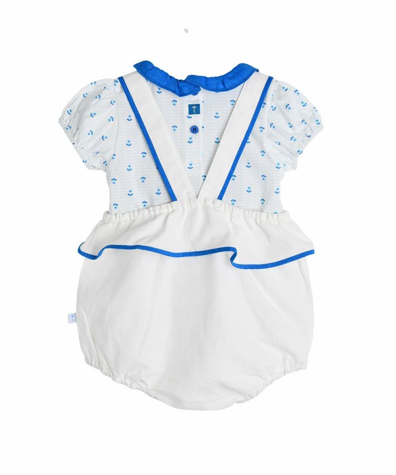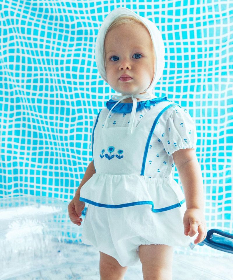 トレンディなエプロンデザインで可愛さをプラスした半袖Tシャツとカバーオールのセット。ブルーカラーの配色が爽やかなイメージを与え上品な刺繍グラフィックがポイントとなるアイテム。着心地がさらに柔らかく洗濯後も変形が少ないアイテム。ブルーミングワンピース(M252OPB15P)と姉妹ルックがおすすめです。