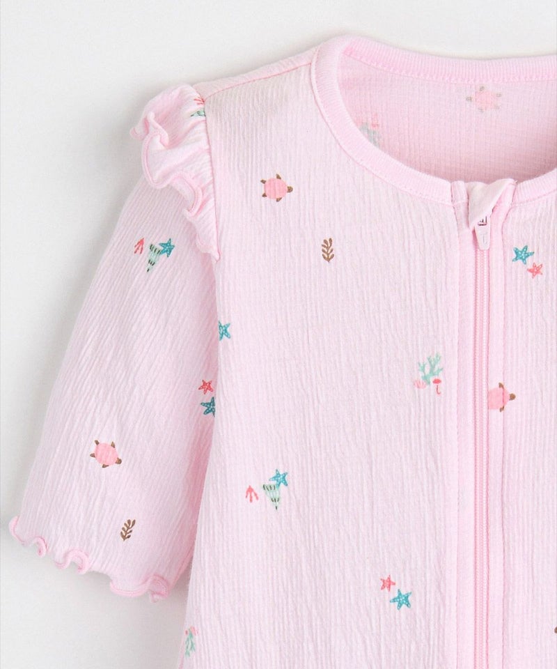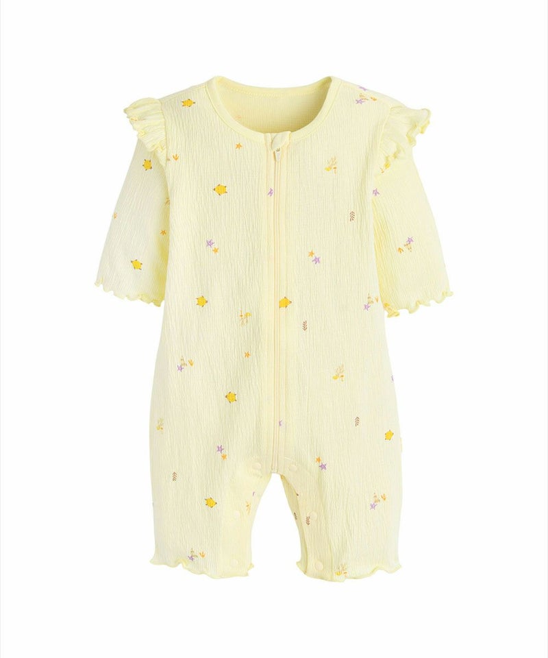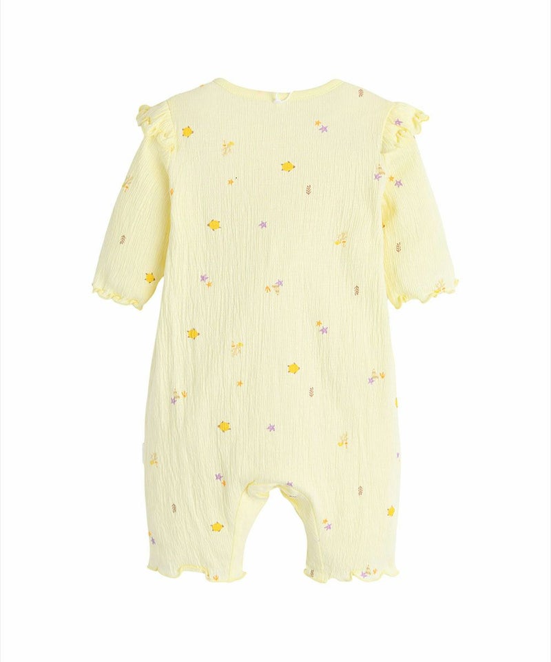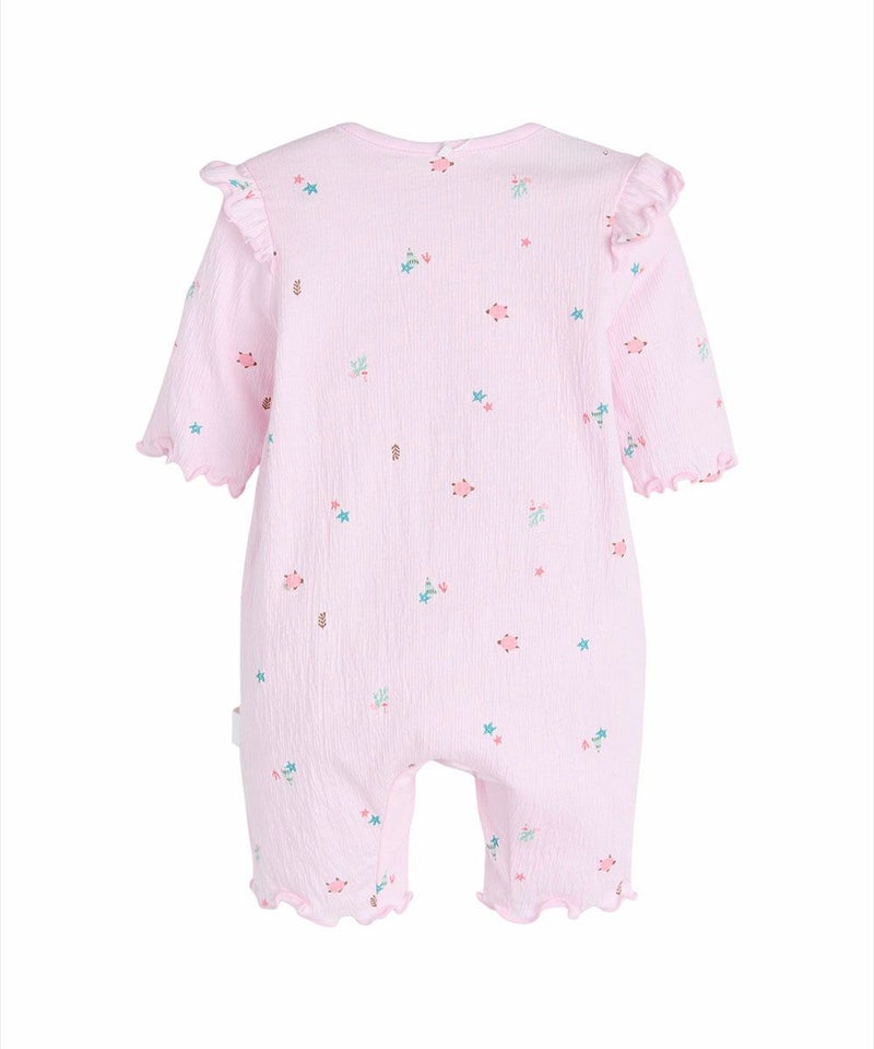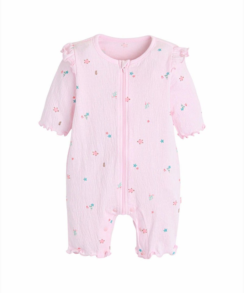 伸縮性に優れた素材を使用した7分袖ロンパース。素材特有の素材感で体につきにくく快適な着心地を与えてくれます。ヒトデやカメ、海藻など海の仲間たちのプリントに加え、肩フリルでCuteをプラス。着脱しやすいファスナータイプで、上まで上げた時に引手がお子様に触れないように生地でカバーしています。ベビーギフトとしてもおすすめです。
