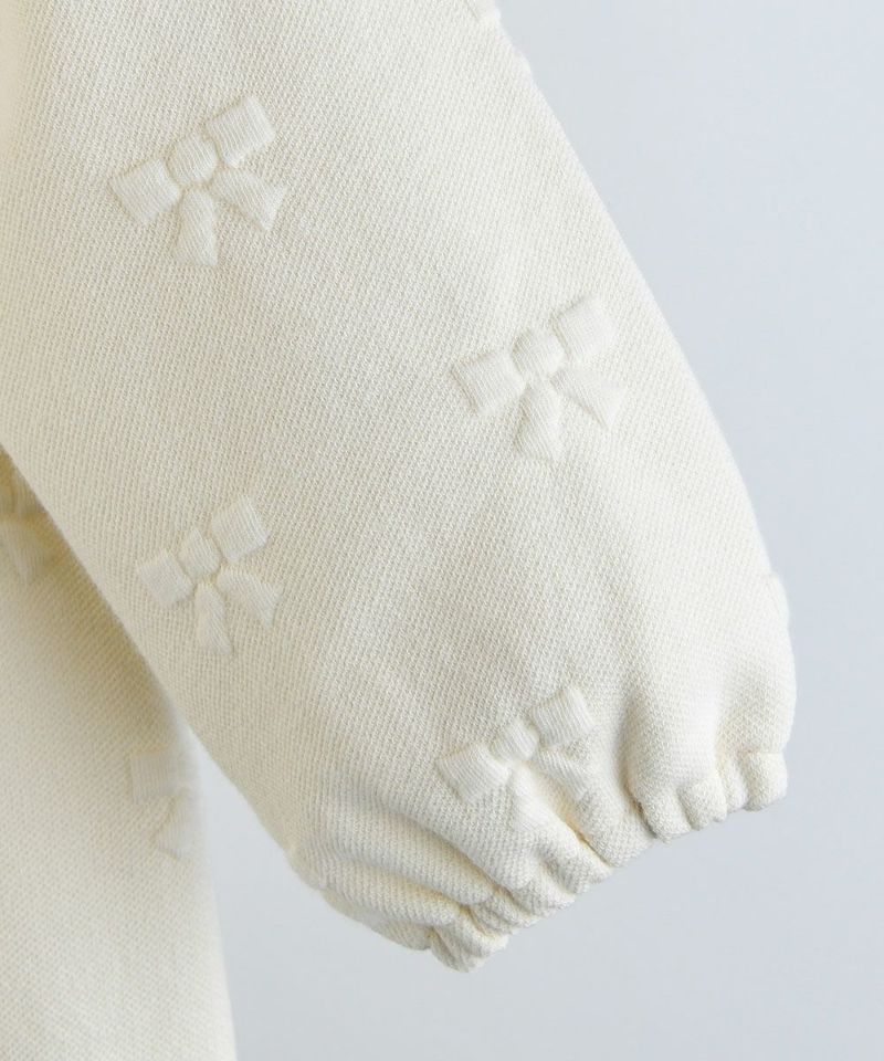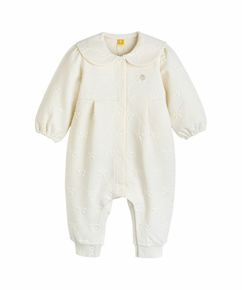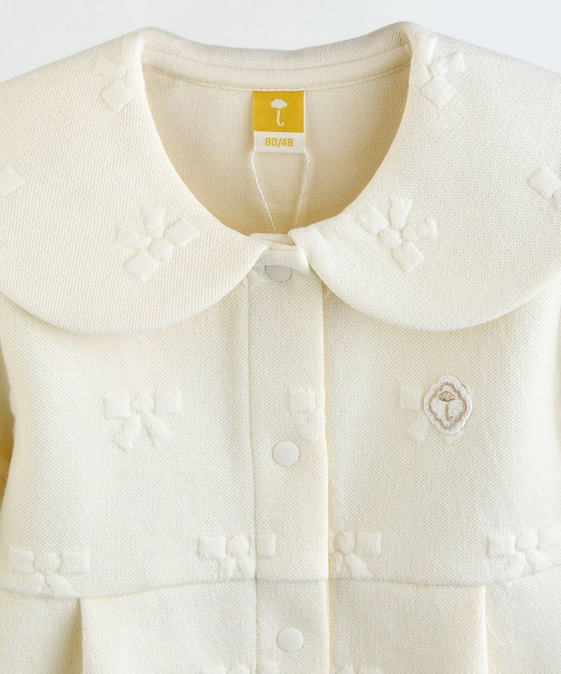 立体感のあるリボン柄がちりばめられたジャカード織りのカバーオールと帽子のセット。カバーオール。カバーオールはフロントと股下すべてスナップボタンで脱着が簡単にでき、袖口はゴム入りでフィット、裾はリブ付きです。胸元にはブランドマークの刺繍のワンポイントと首元の丸みのある大きな襟がCute。付属の帽子は首元にゴム入りでフィット感もありつつ、顎ひも付きで落下防止もしっかり対応。さりげないレース使いもまたおしゃれポイントです。カーディガン(M253GDB06P)と姉妹ルックがおすすめです。