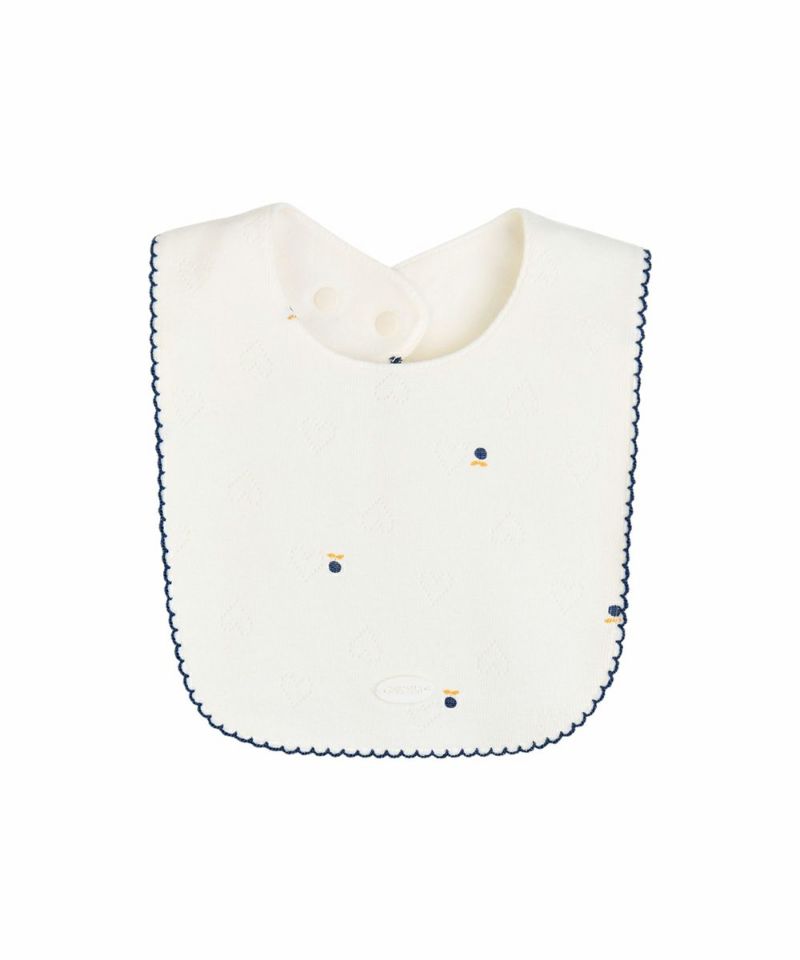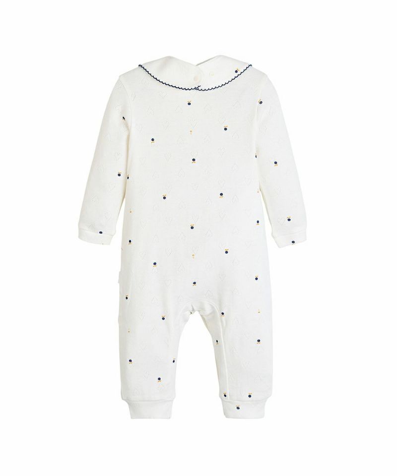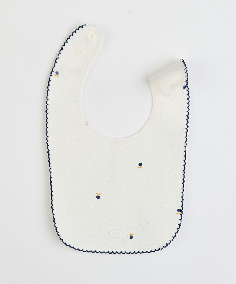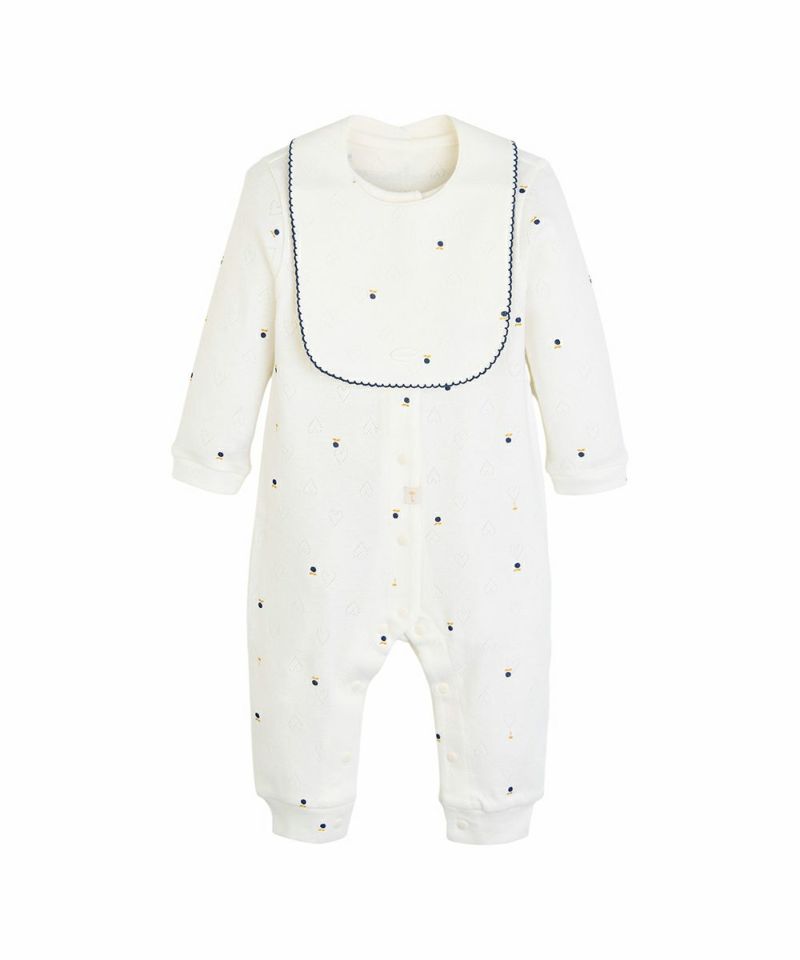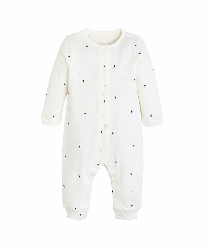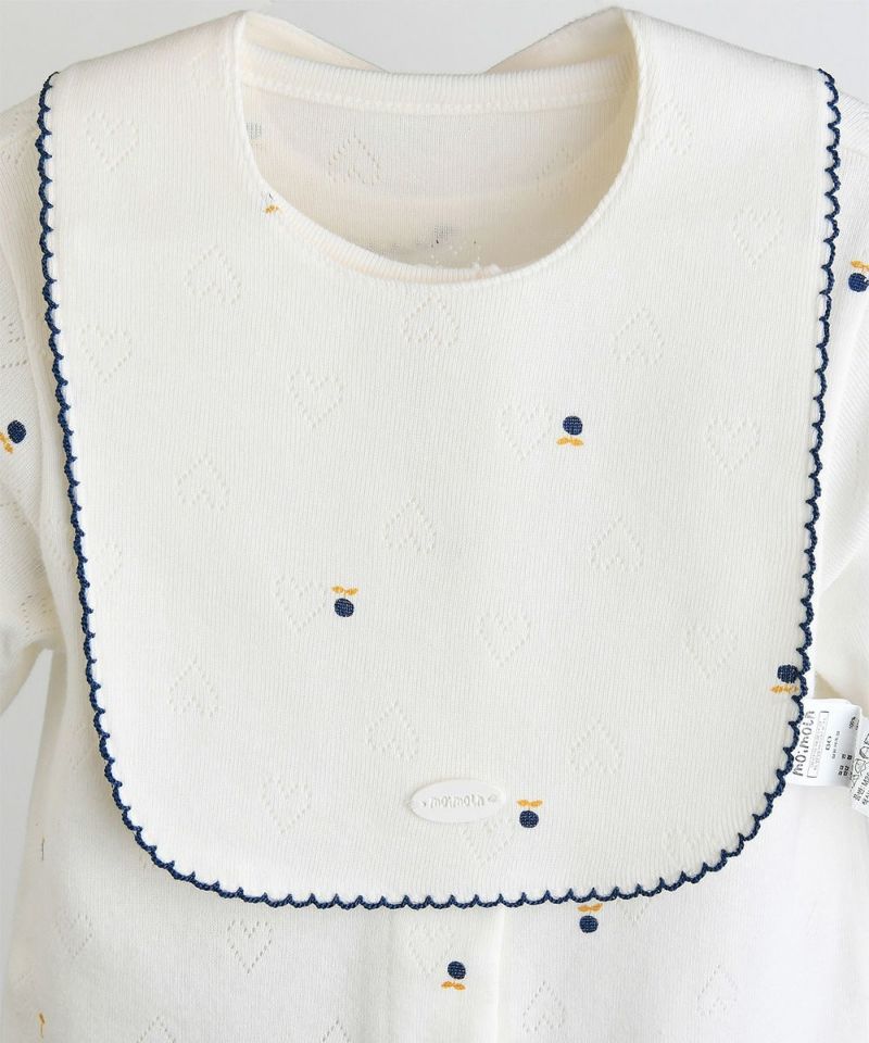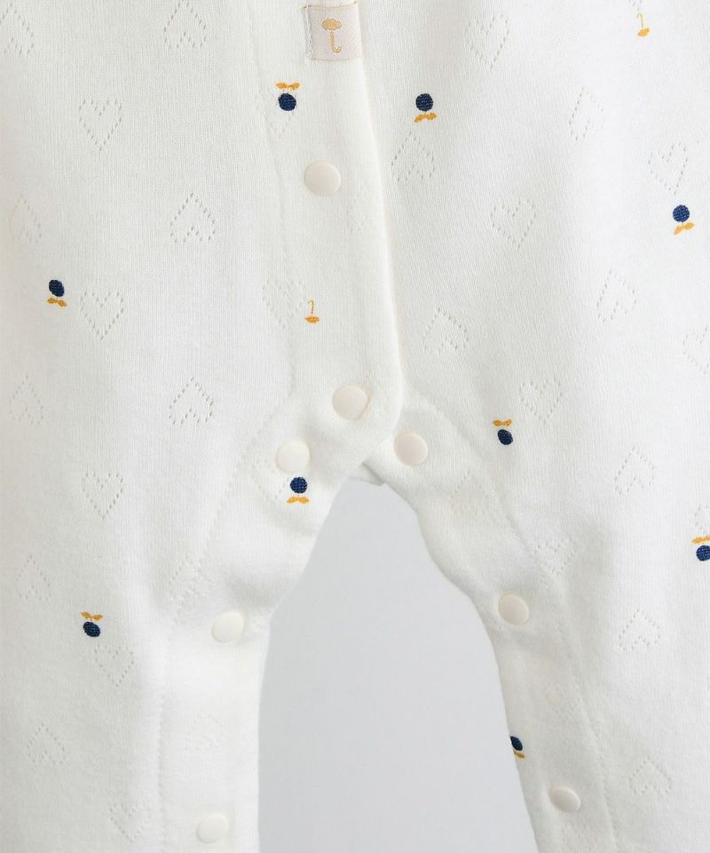 ハートのジャガード生地の上にブルーベリーとブランドマークのモチーフがちりばめられたカバーオールとスタイのセット。セットのスタイの縁にはネイビーのパイピング刺繍とさりげないブランドロゴプレートがあり、クラシックで高級感のある雰囲気。フロントから裾までのスナップボタンで脱着も簡単、袖口と裾はリブ仕様です。コットン100%で吸水性・通気性に優れた綿素材で、寝汗もさらっと通し、寝起きも快適です。