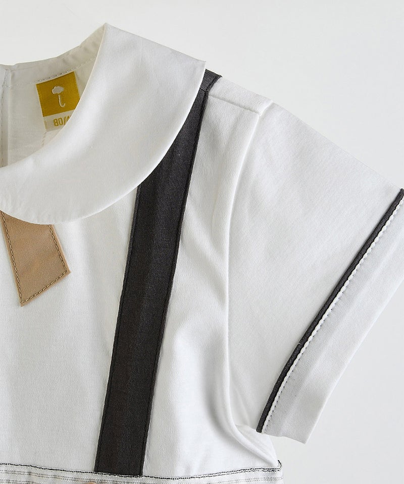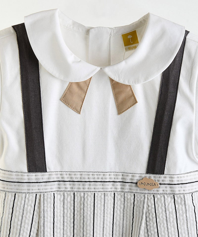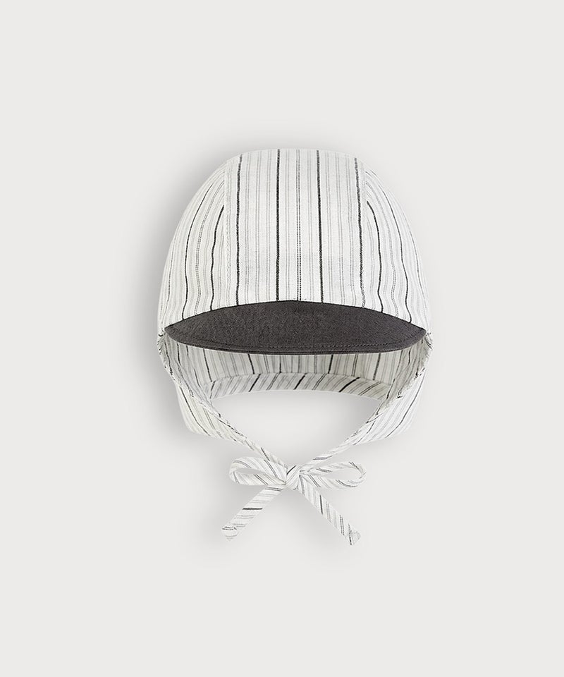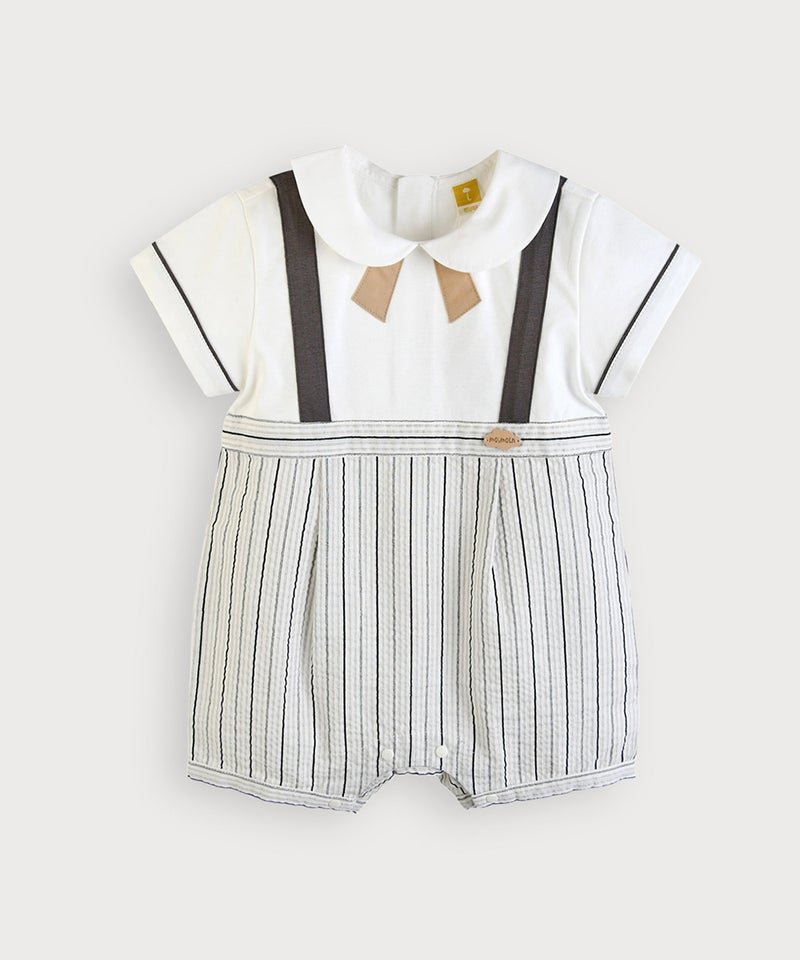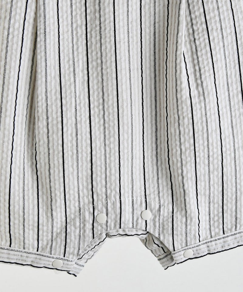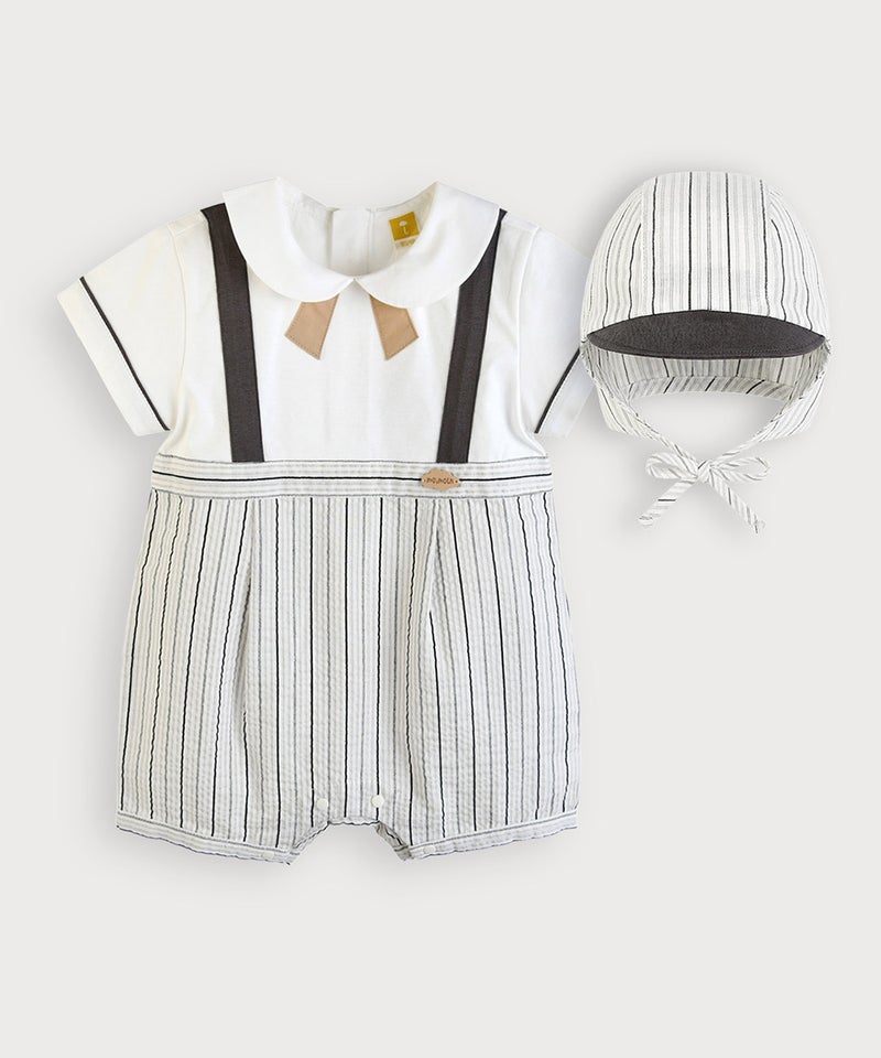 モダンなストライプのウーブン生地を配色した、夏にぴったりのスーツ風ロンパースと帽子のセット。