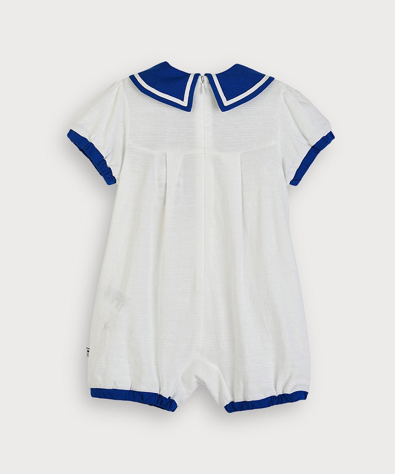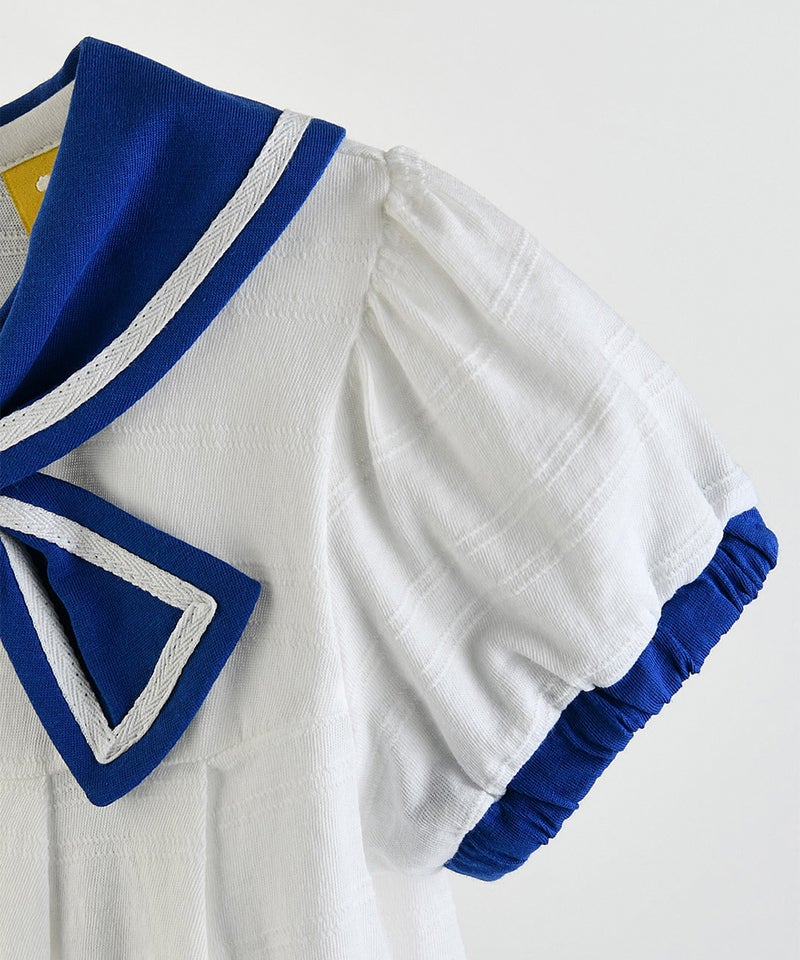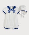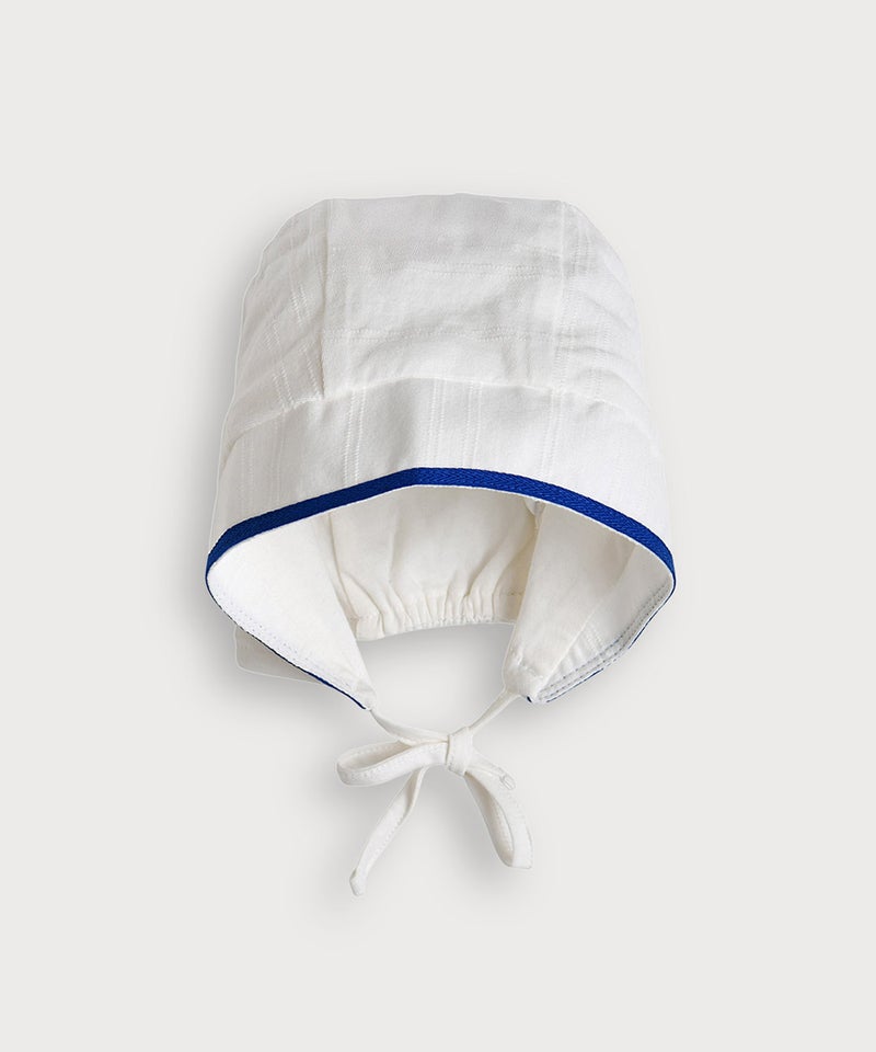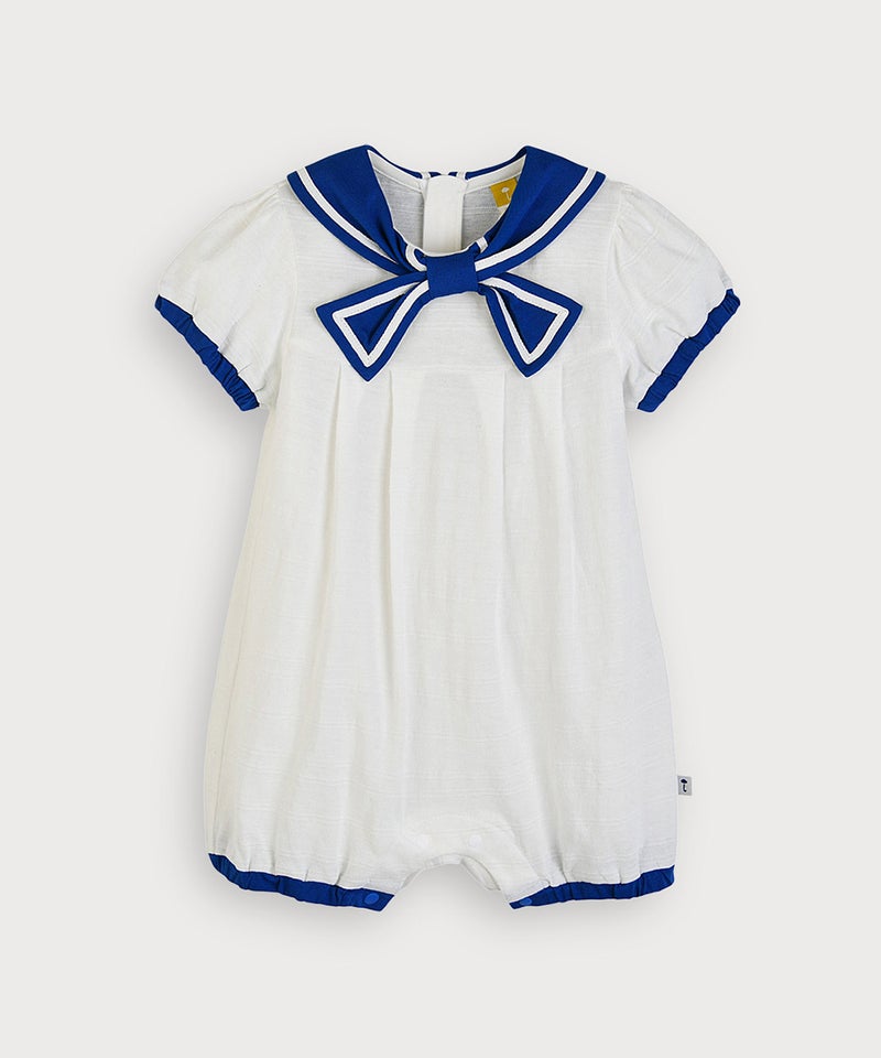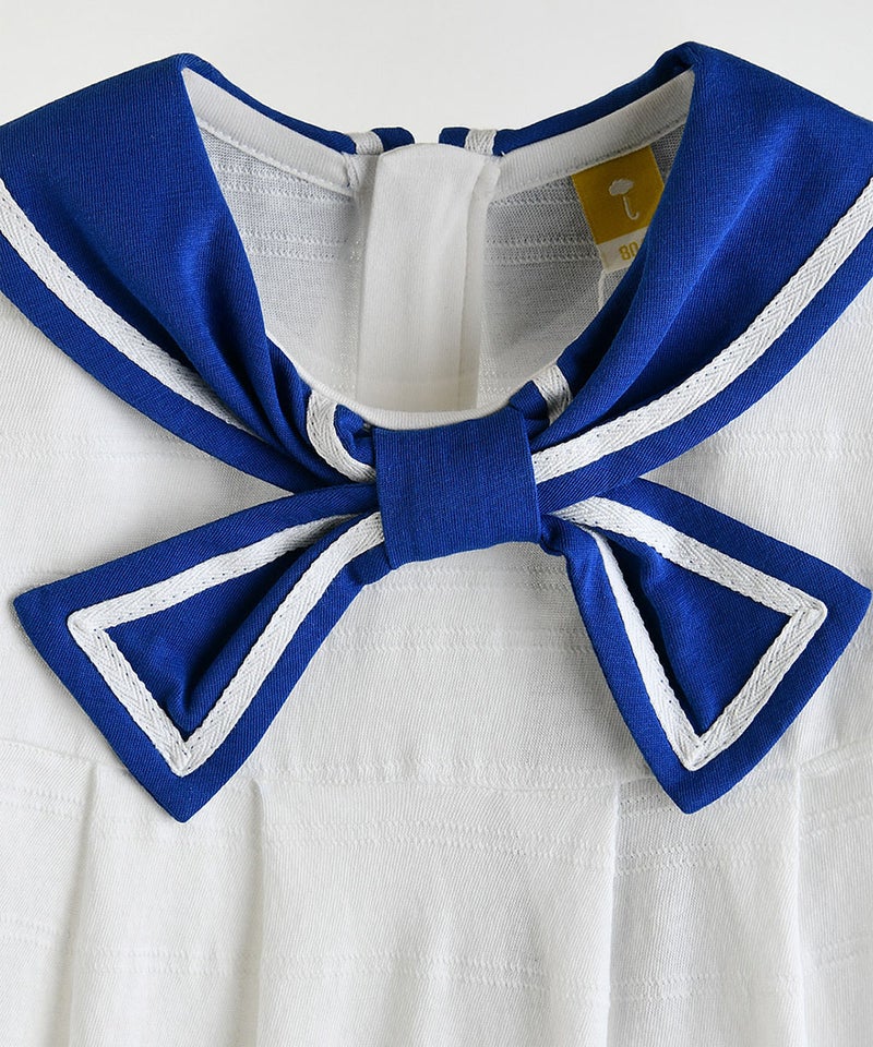 鮮やかなブルーの襟リボン風モチーフがポイントになっています。帽子はマリンテイストのあるデザインのボンネット帽で落下防止のための紐が付いています。