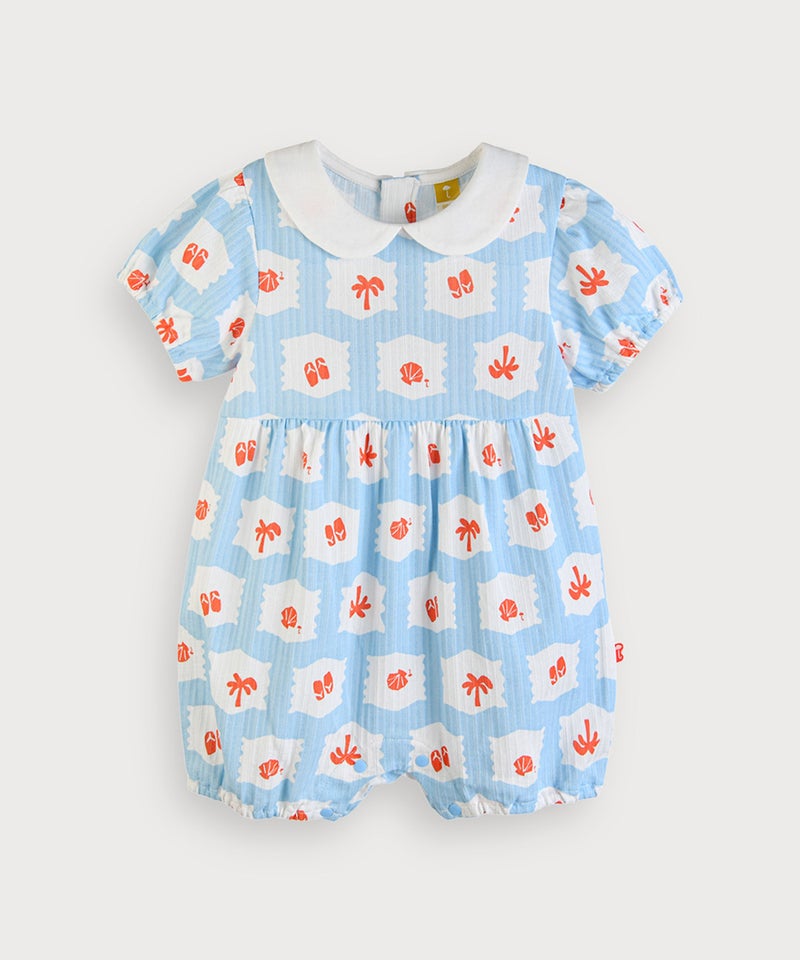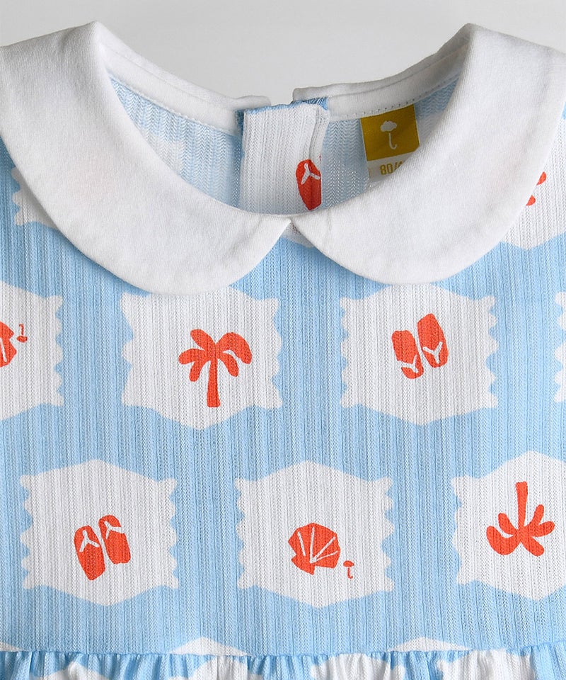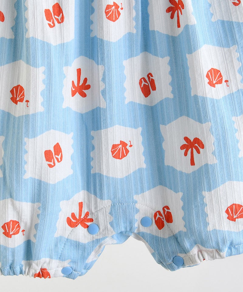 夏らしいアイテムたちがパッチのようにプリントされた丸襟付きの半袖カバーオール。
