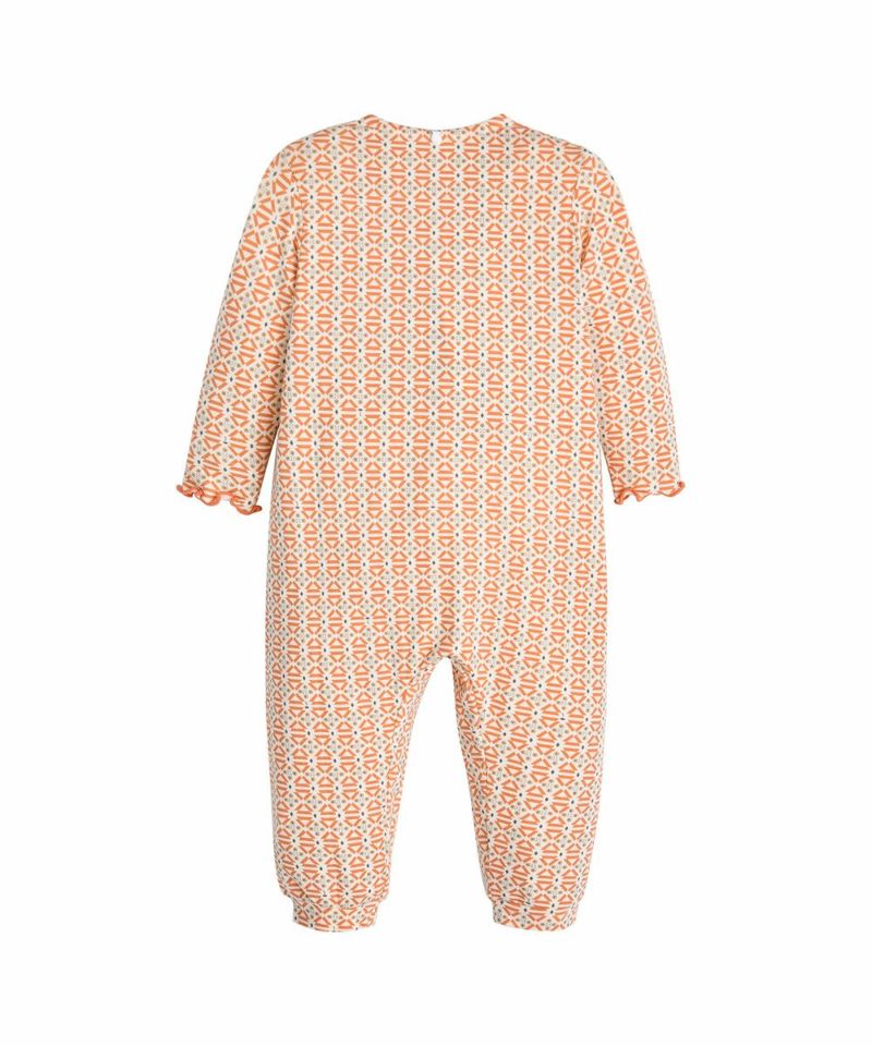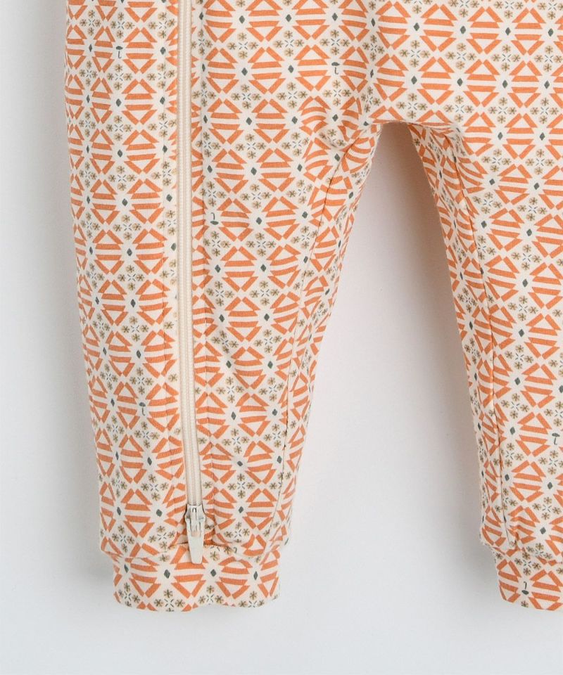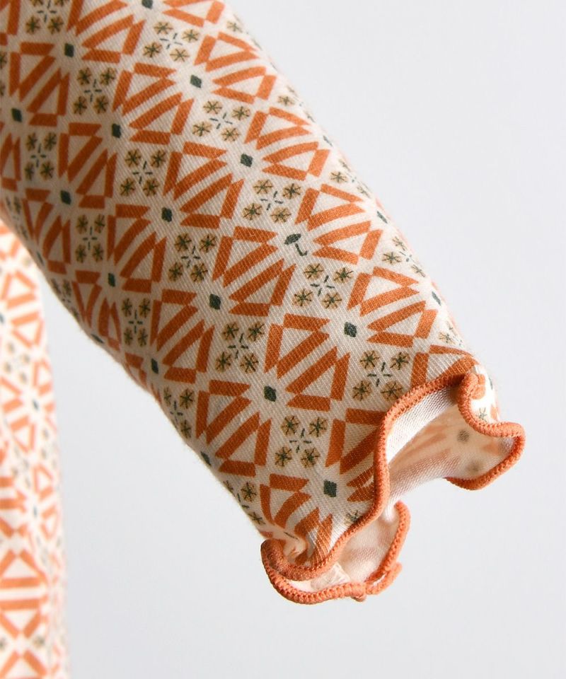 モダールコットン素材を使用しており、肌触りがよく、ストレッチ性があり動きやすいカバーオール。ネックのフリルがポイントで、ファスナー付きなので簡単に着脱できるアイテムです。