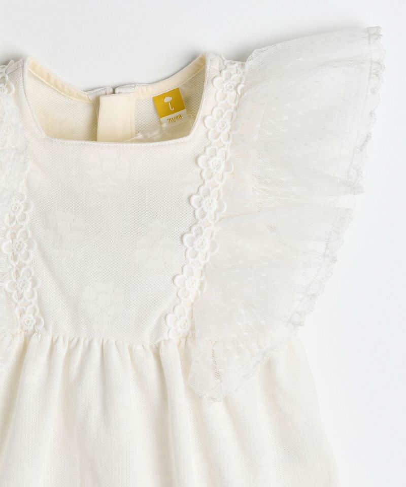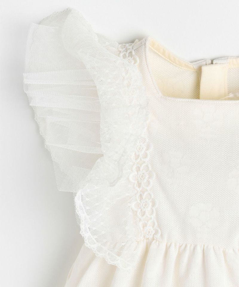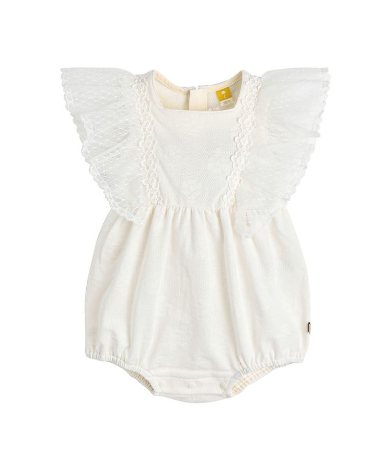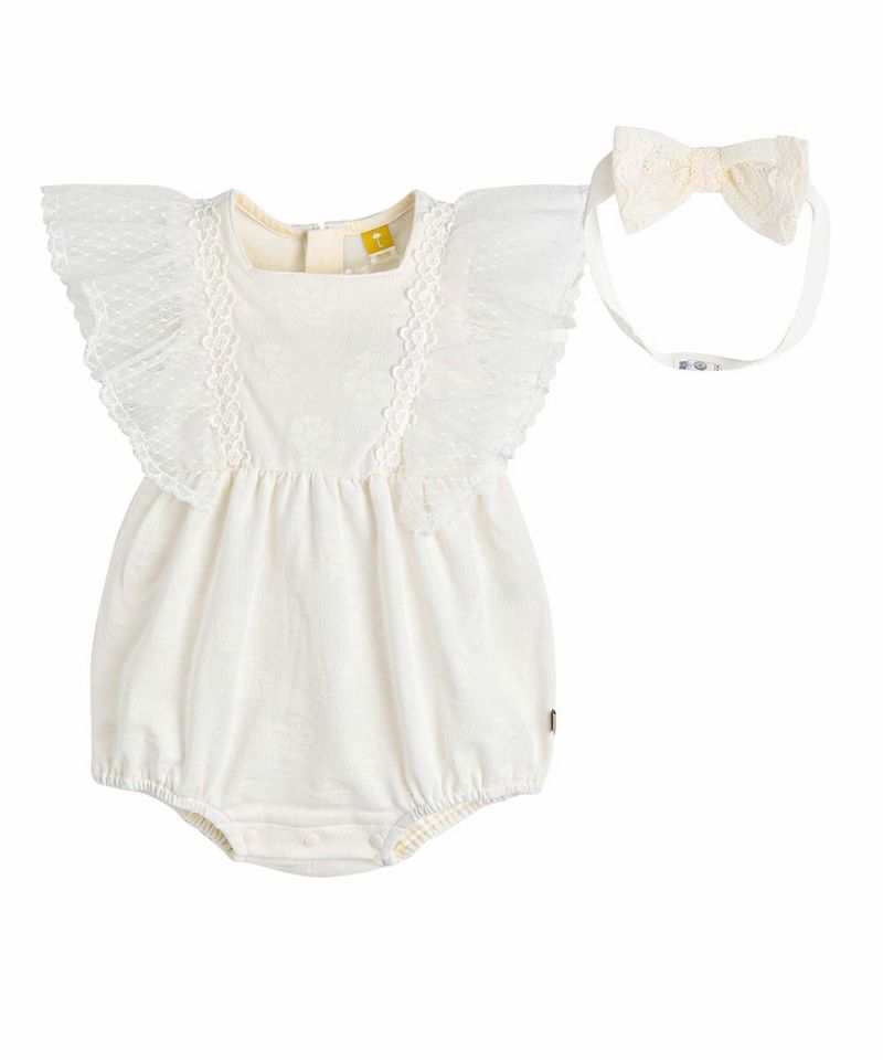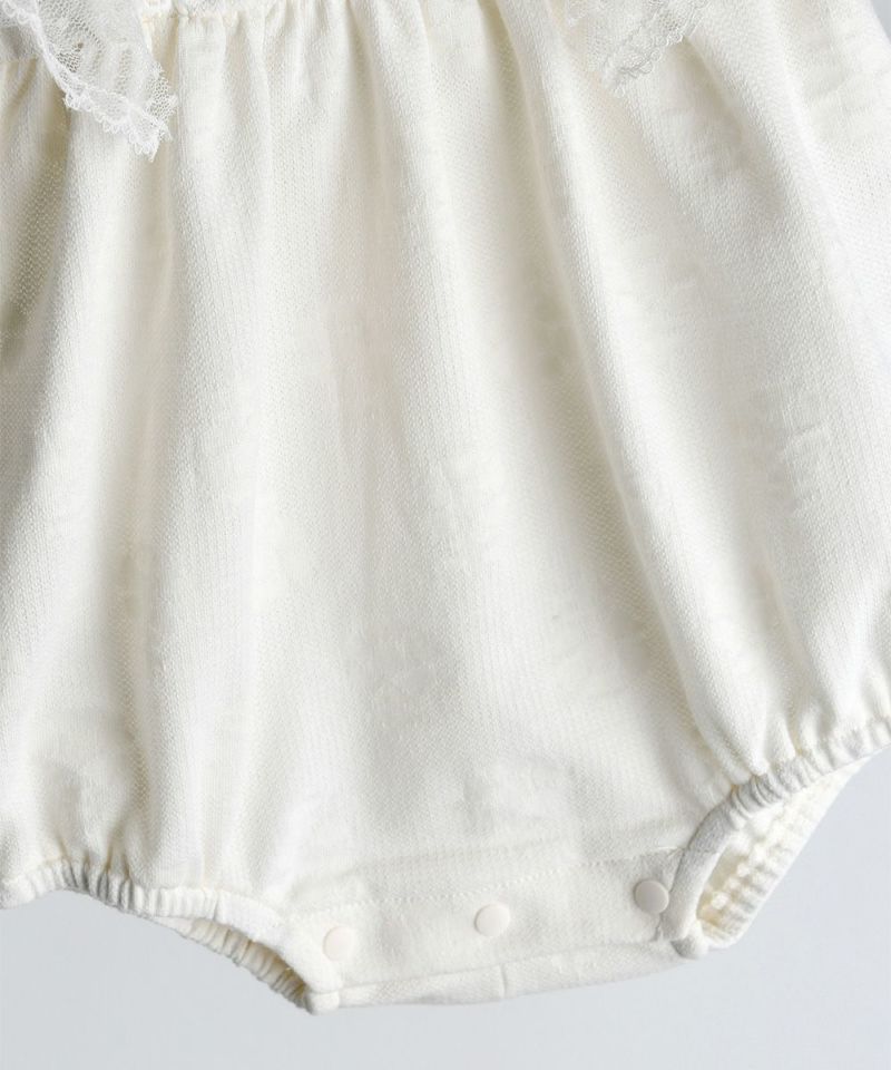 高級感のあるジャガード素材を使用したカバーオール。袖のドットジャガードチュールデザインとフラワーレースが特別なムードにしてくれるアイテム。ヘアバンドセットなので、ギフト用としてもおすすめです。
