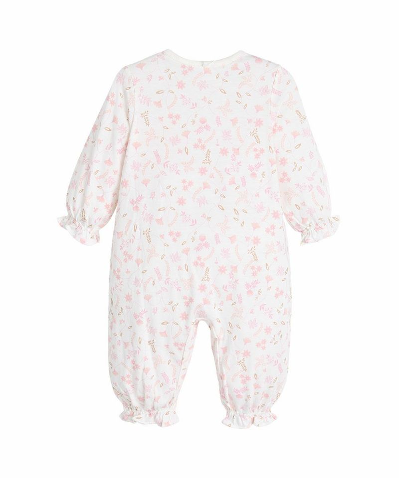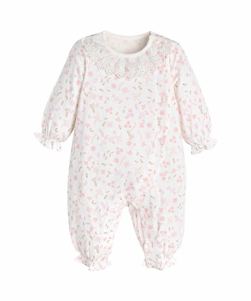 小花柄とレースがポイントのカバーオール。抗菌_消臭効果に優れた柔らかいバンブー素材を使用している肌触りの良いアイテムです。