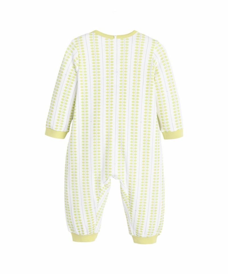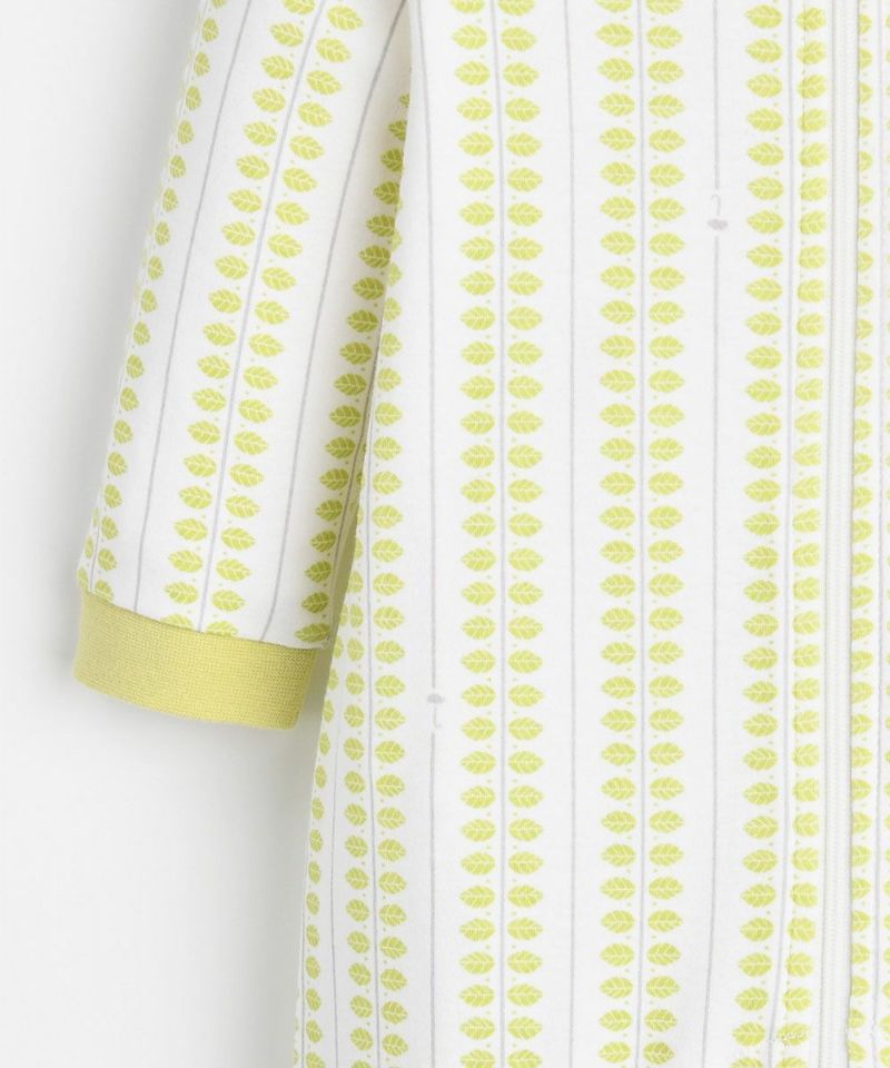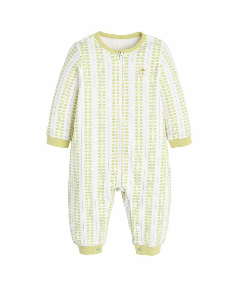きれいなリーフ柄に手足のテーピングがポイントのカバーオール。ファスナー付きなので着脱が簡単なアイテムです。