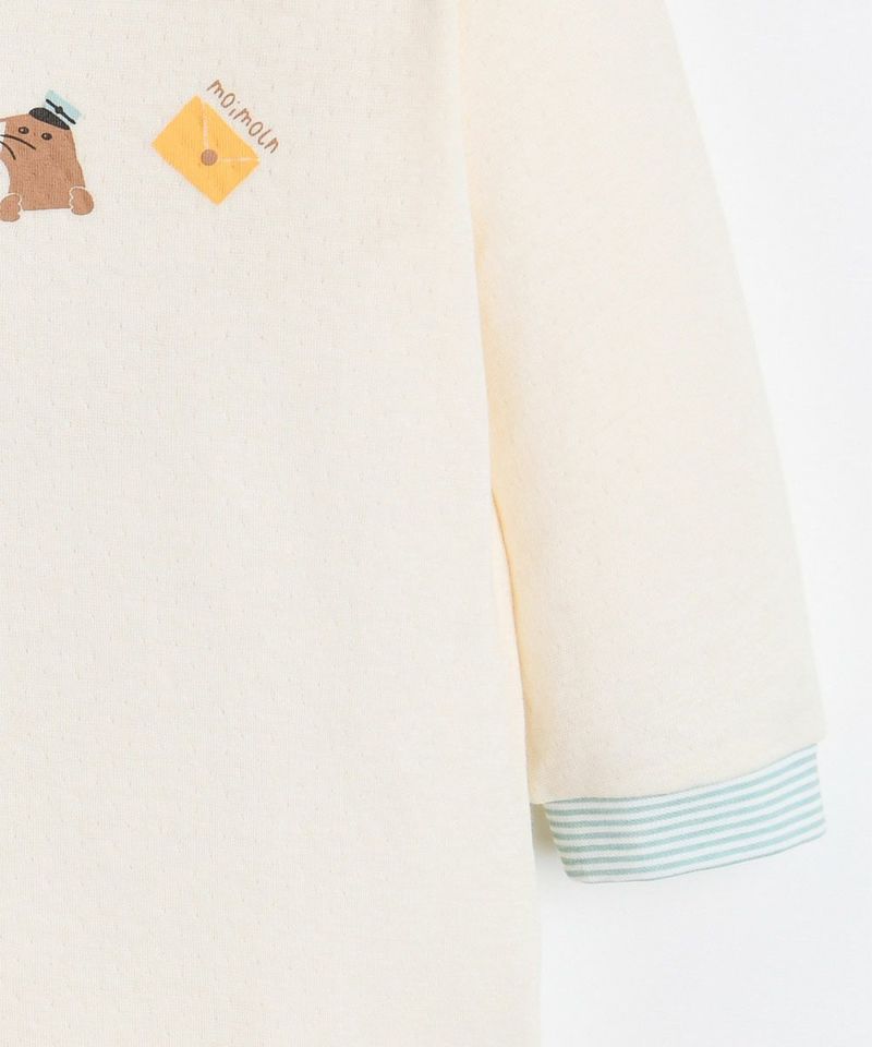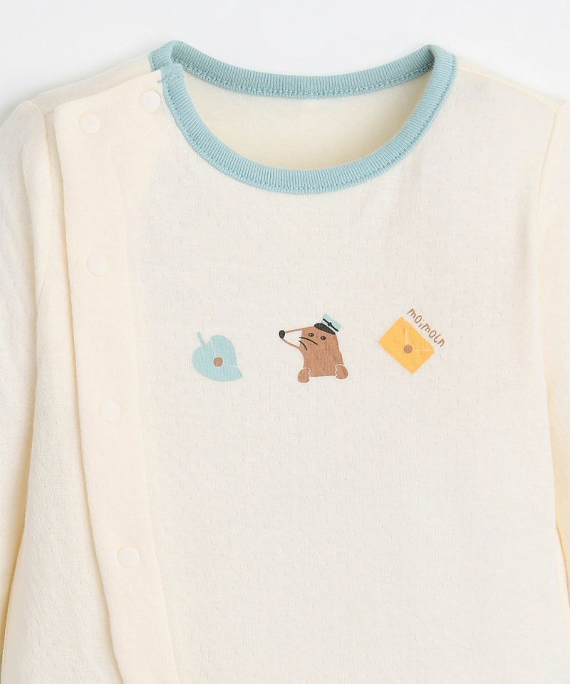 柔らかい両面ジャカード素材のカバーオールと鈴のついた帽子がセットのセットアイテム。ベビーギフトとしても喜ばれるアイテムです。