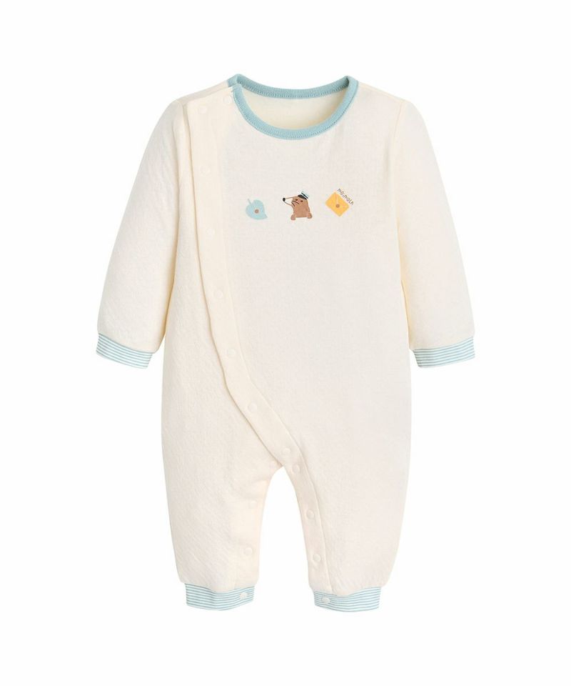 柔らかい両面ジャカード素材のカバーオールと鈴のついた帽子がセットのセットアイテム。ベビーギフトとしても喜ばれるアイテムです。
