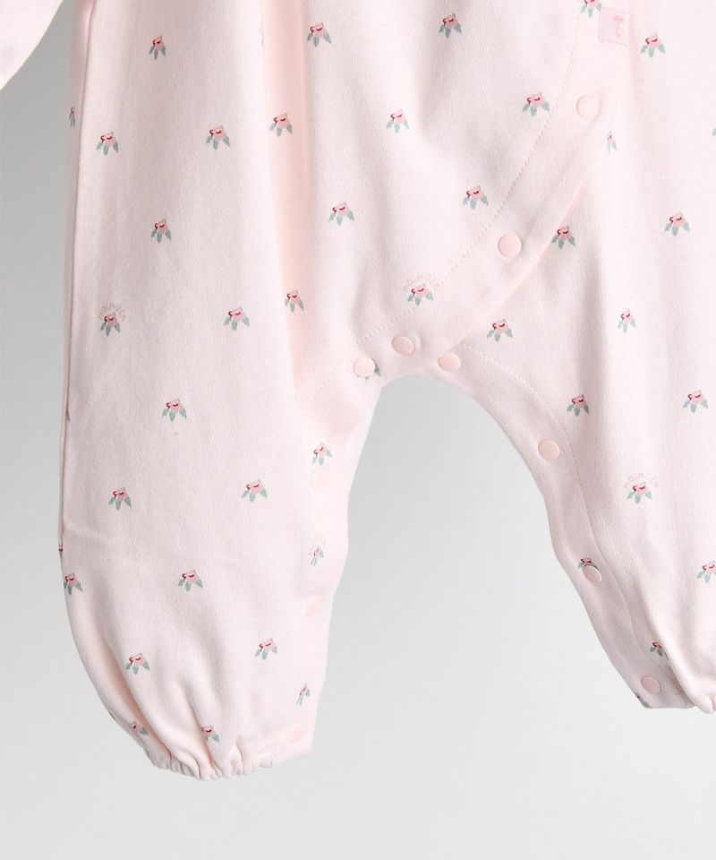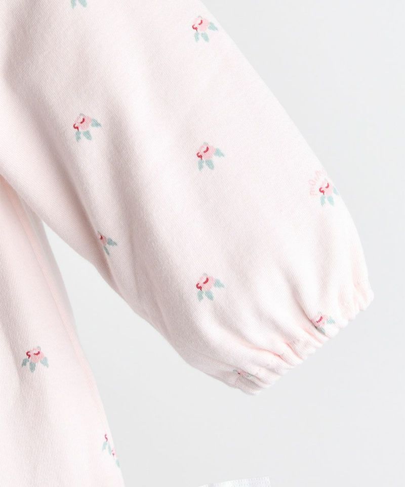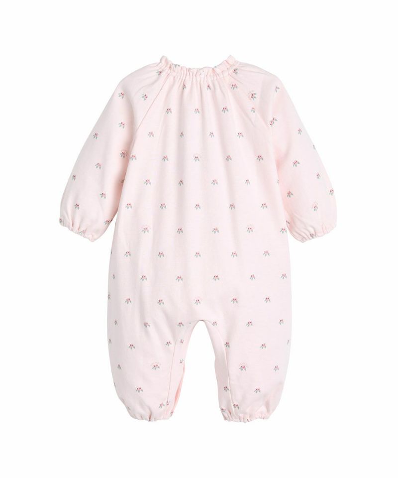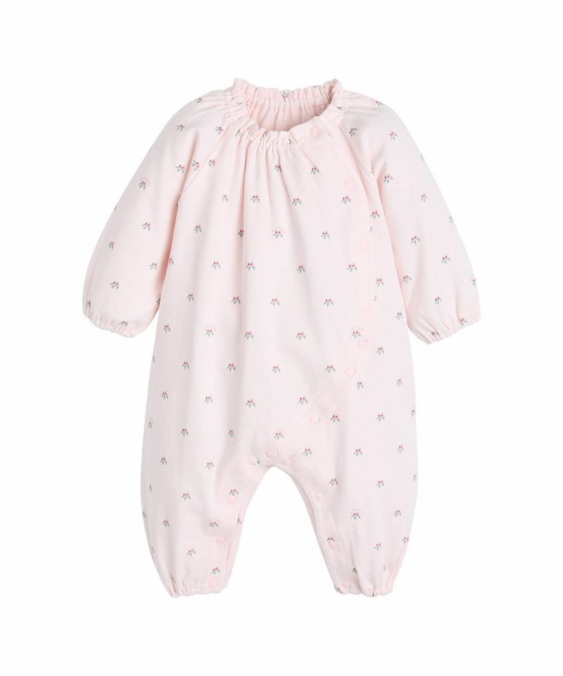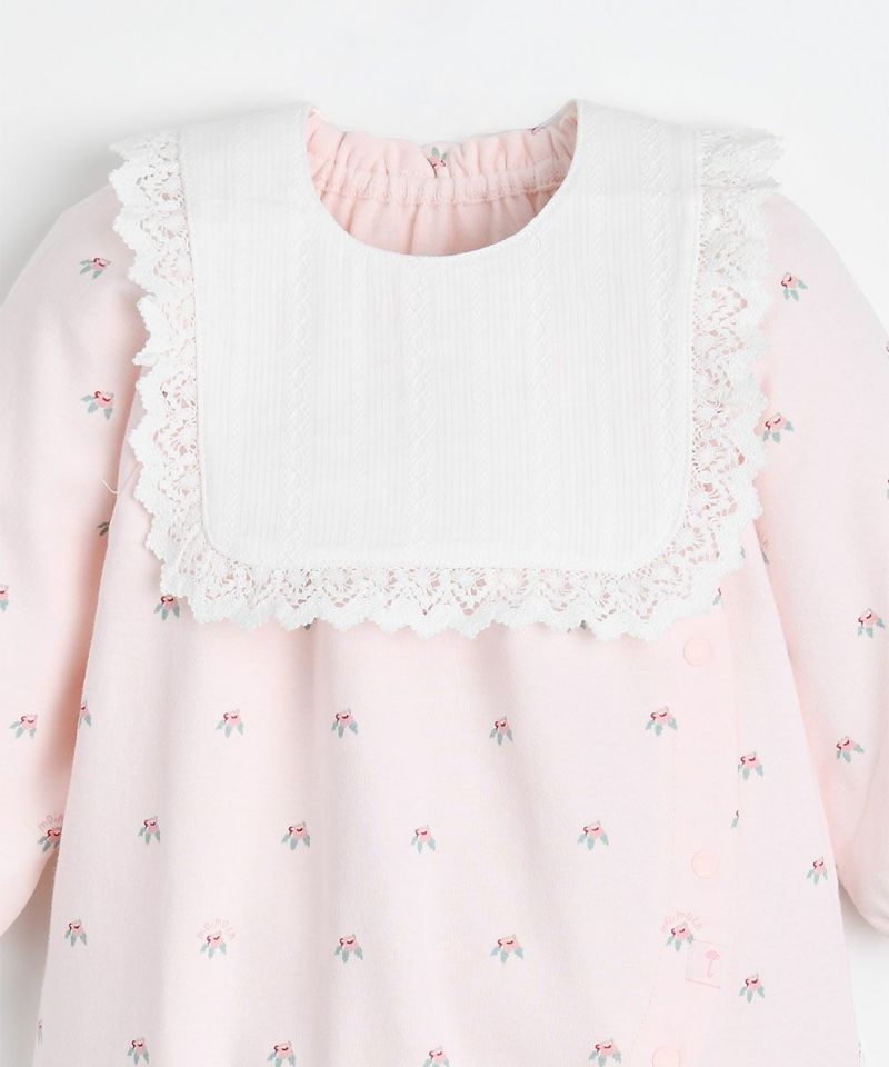 フラワー柄の総柄のカバーオールとレースがおしゃれなスタイの2点セットアイテム。スタイのフリルが上品でかわいいアイテムで、ベビーギフトとしても喜ばれるアイテムです。