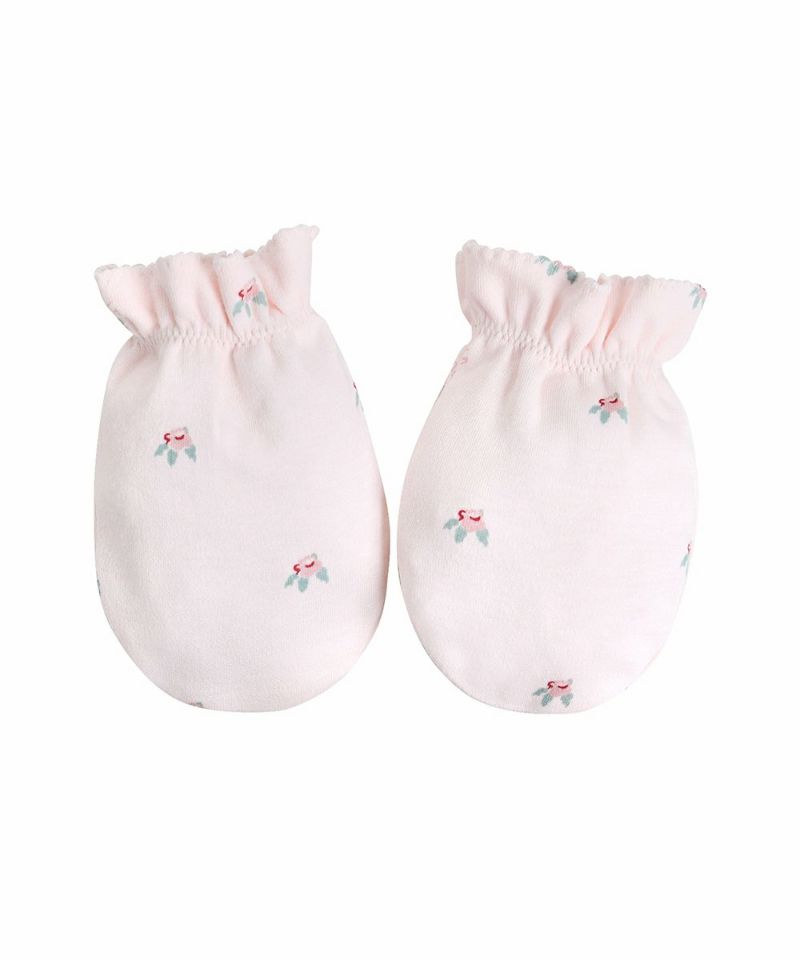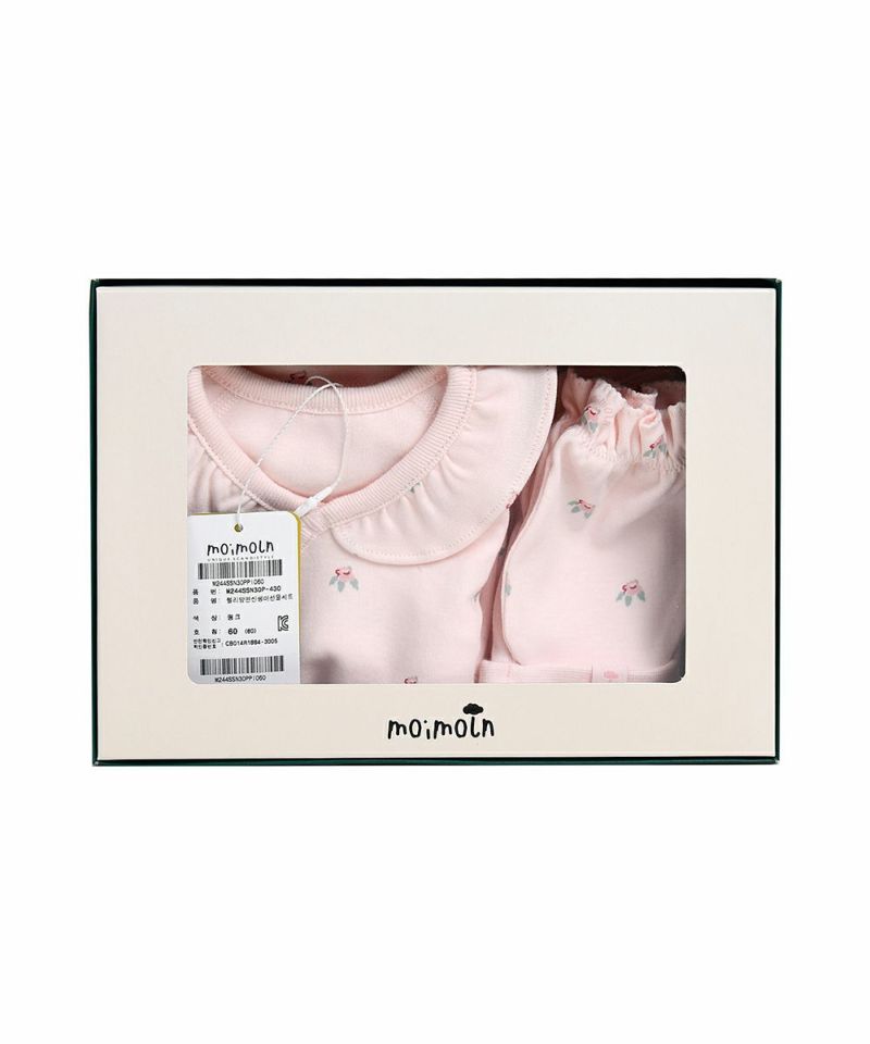 フラワー柄が全面にプリントされた新生児用ギフトセット。短肌着、帽子、ミトンがセットのため、ベビーギフトとしても喜ばれるアイテムです。
