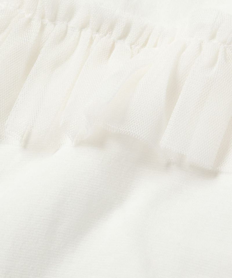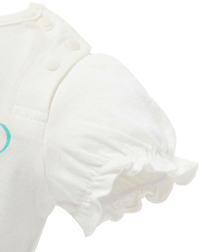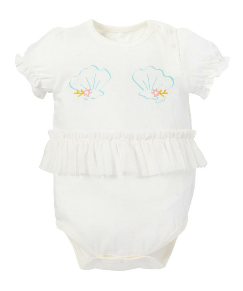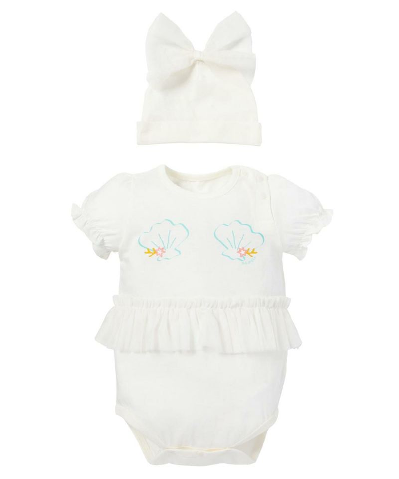 シェルプリントがキュートなロンパース。ウエストにチュールのフリルがポイント♪帽子とセットなためプレゼントにも喜ばれるアイテムです* カタログ掲載