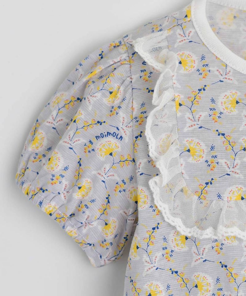 上品な雰囲気の花柄をプリントした半袖ロンパース。レースをあしらったフリル付きの襟が女の子らしいデザイン♪優しい肌触りでおすすめの1枚です。