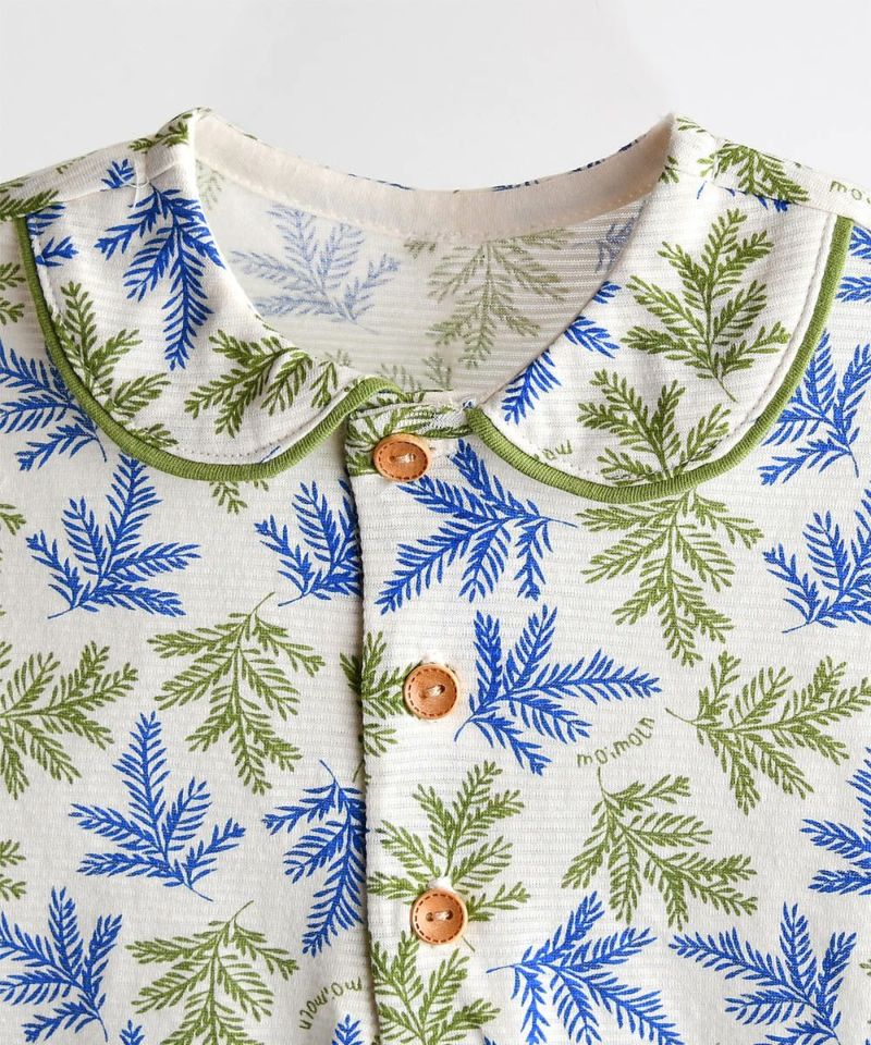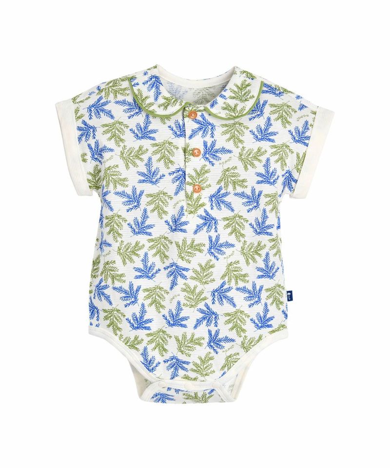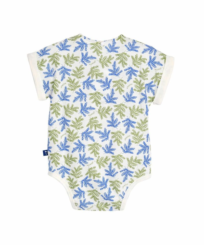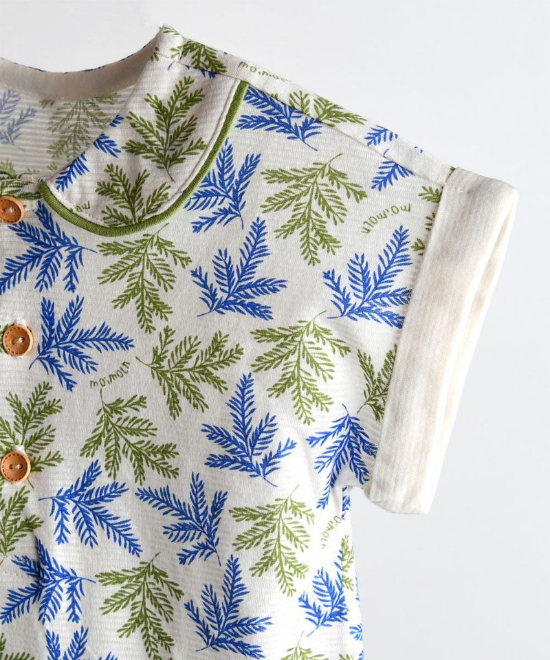 トロピカルな感じのリーフ総柄とロールアップ袖と襟先のグリーンカラーのパイピングがポイントの半袖ボディスーツ。シダーリーフ前ボタントップス&パンツ(W242NNN47P),シダーリーフトップス&パンツ(W242NNN49P)と兄弟ルック、兄妹ルックがおすすめです。