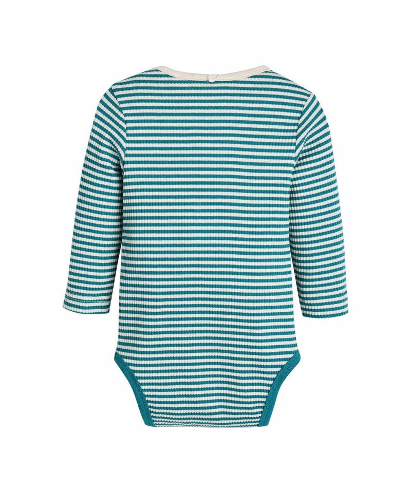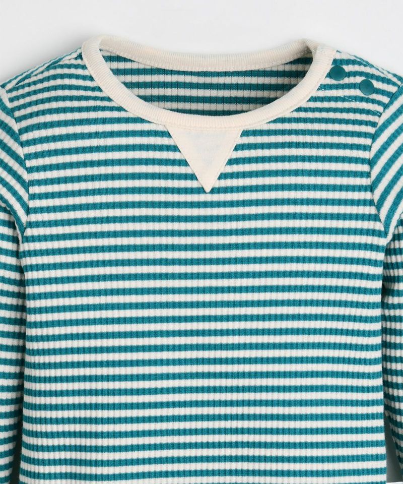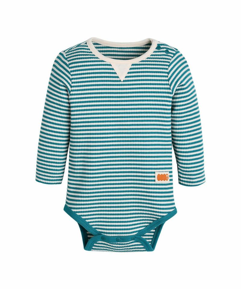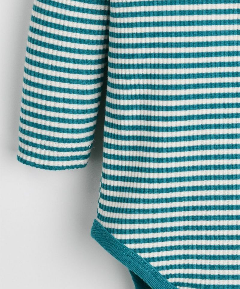 伸縮性に優れた動きやすい素材でお出かけ用としても活用できるロンパース。ボーダーがおしゃれなアイテムです。