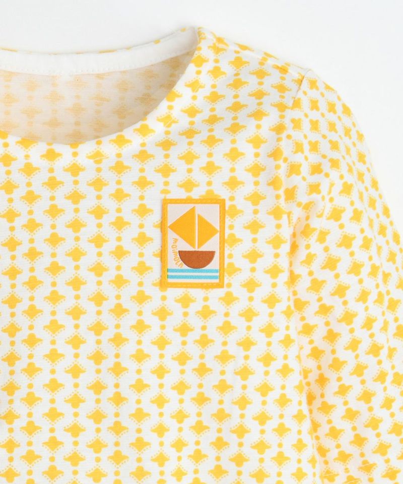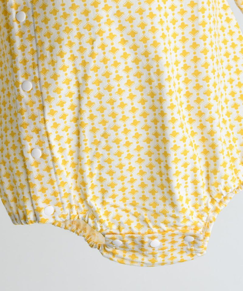 モイモルンらしいイエローの太陽プリントに胸元のヨットマークがアクセントとなった七分袖ボディスーツ。お着替え時もスナップボタンで脱着がしやすくなっています。ベビーギフトとしてもぜひ。品番(M2522AN04P)とのコーディネートもおすすめです。