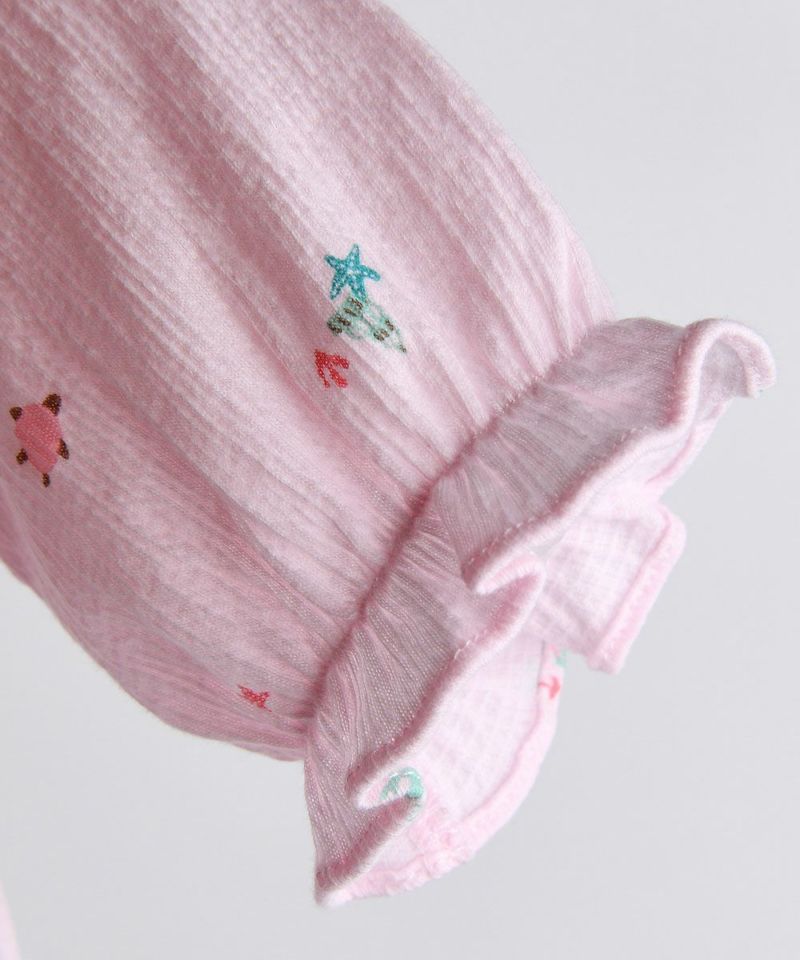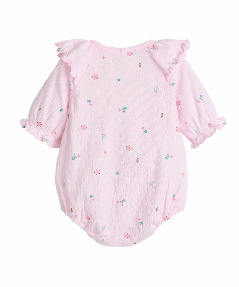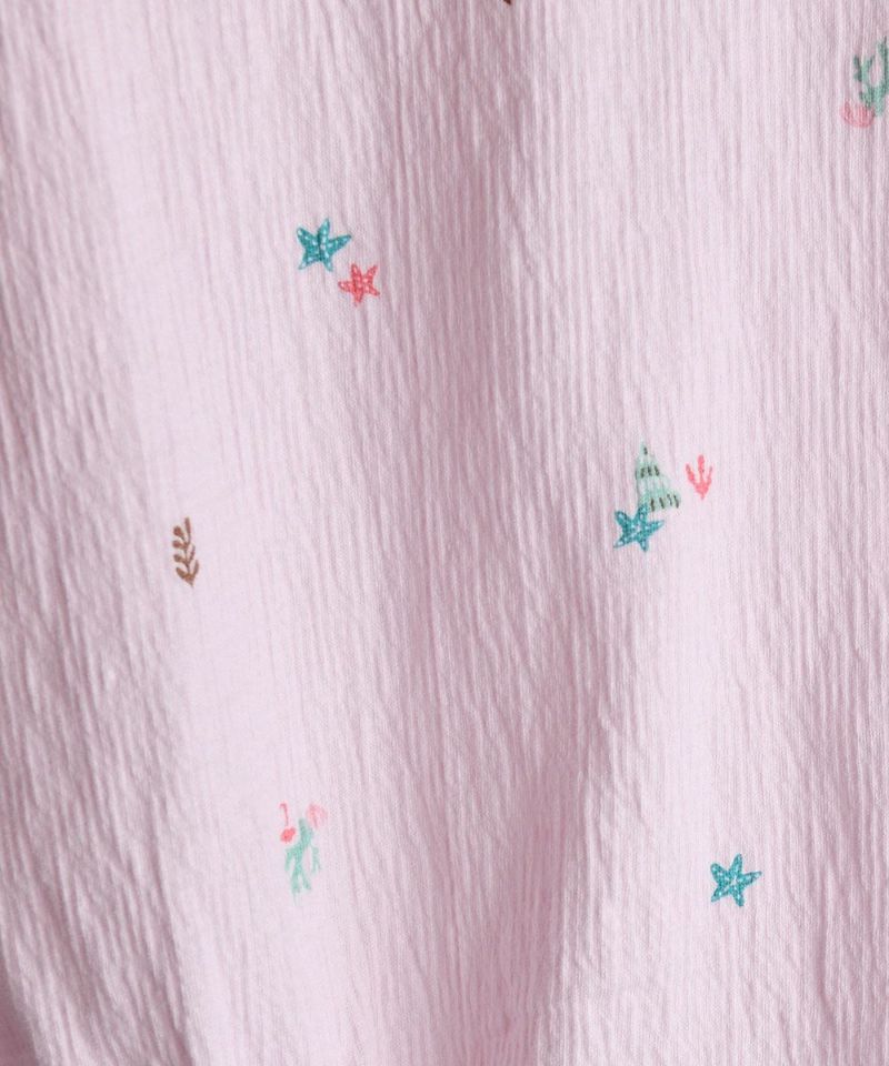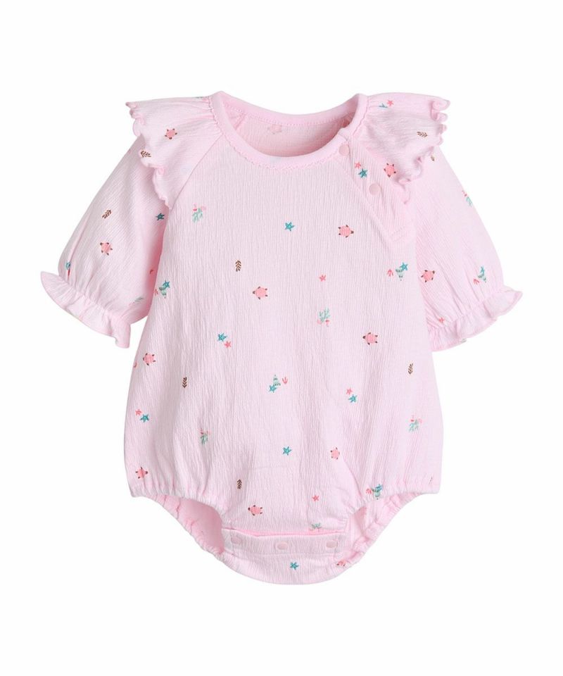 肩にフリルをあしらったCuteな七分袖ボディスーツ。ブルーやピンクの星や海の仲間がちりばめられていてモイモルンらしいラブリーなプリント。おでかけにもぴったりで、お着替え時もスナップボタンで脱着がしやすくなっています。ベビーギフトとしてもおすすめです。