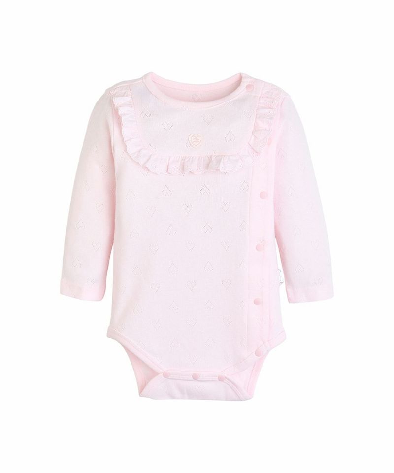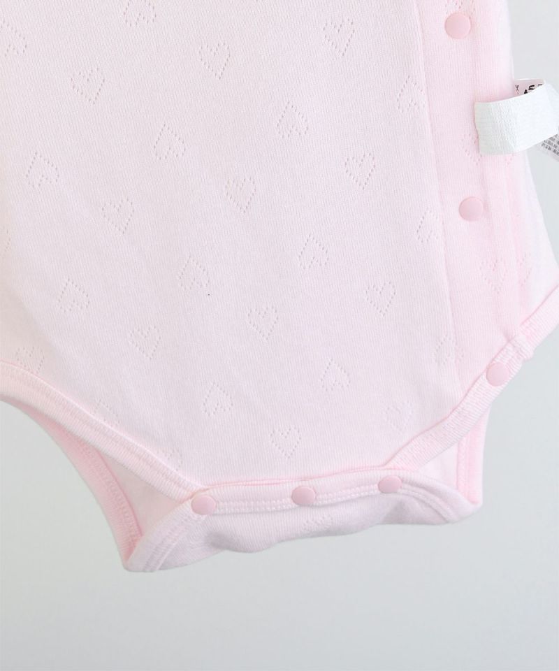 ハートのアイレット生地のボディースーツ型の長袖ロンパースとリボンヘアバンドのセット。フロントは胸元のハートのワンポイントとフリルでラブリーな印象に。フロントから股下までスナップボタンで大きく開くのでオムツ替えやお着替えも簡単。出産祝いなどのギフトにもおすすめです。minimoiとは・・・新生児のための新しいmoimolnのオリジナルシリーズ。