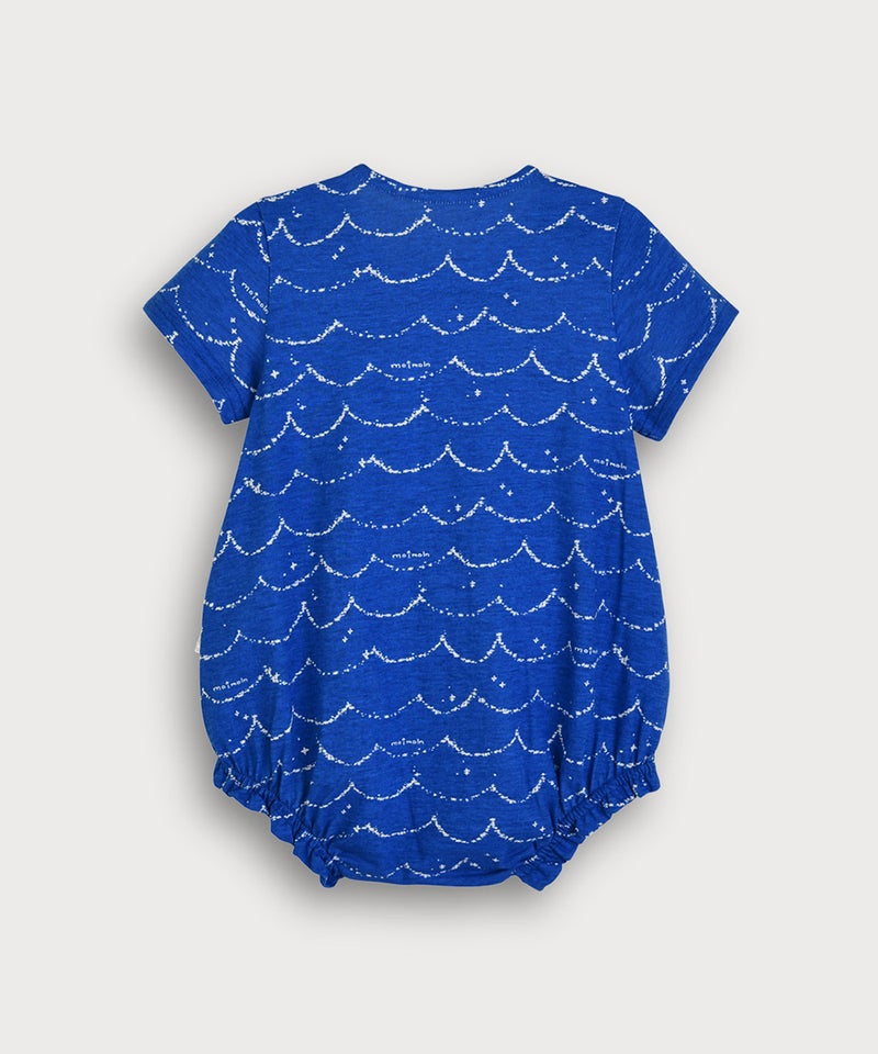 波のようなデザインの半袖ボディスーツと紐付き帽子のセット。