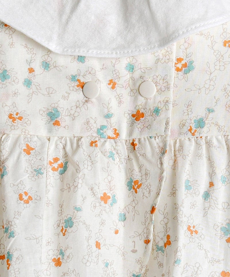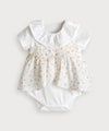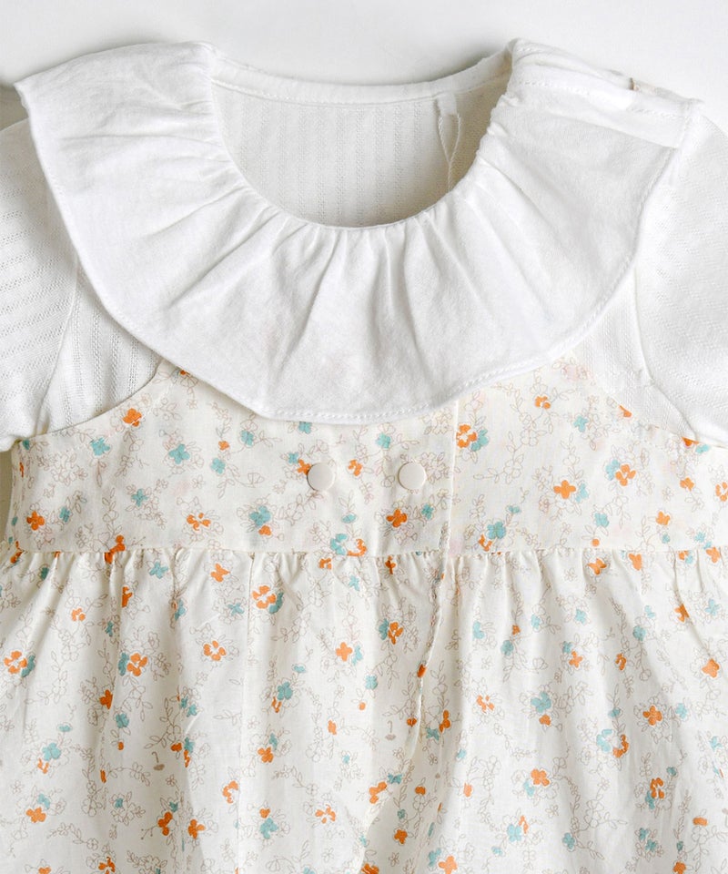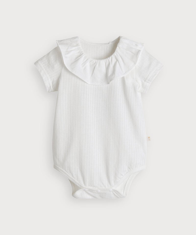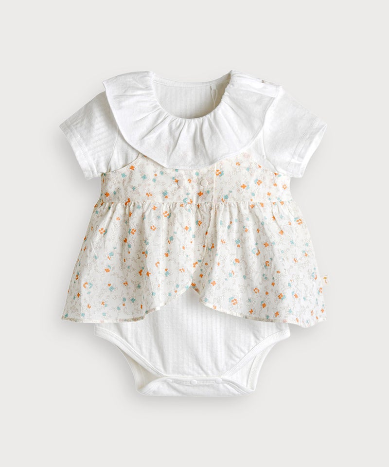 フリル襟付きの襟がかわいいボディスーツにレイヤーでデザインキャミを重ね着することで外出着としてもぴったり。